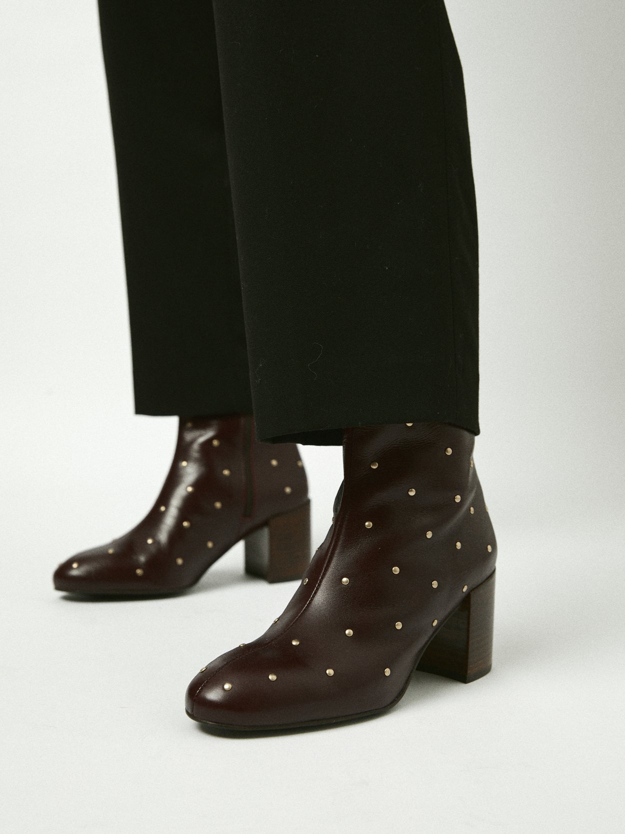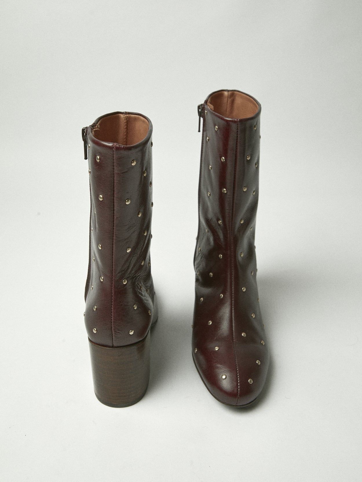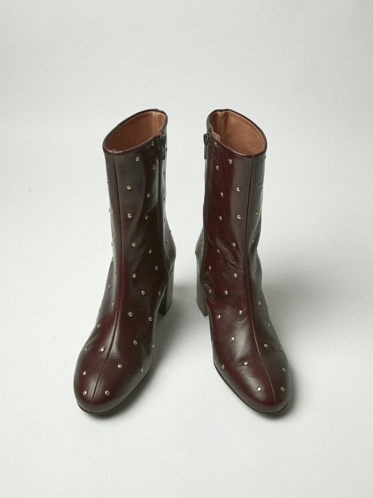 Alfonsina es un botín midi muy estilizado realizado en piel napa premium de alta calidad. Lleva microtachas insertadas en acabado oro y va enteramente forrado en piel. Tacón encastrado forrado suela en un color tostado oscuro que contrasta con la elegancia del vino.