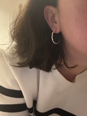 Nuestro nuevo Hoop Pía Mid Plata se incorpora a la familia de pendientes de JIMENAS como un fondo de armario para el día a día. Diseñado y fabricado en España, el Hoop Pía, cuenta con nuestro icónico trabajo de tachas y gotas, aportándole un brillo único a nuestro diseño. Esta pieza ha recibido un tratamiento antialergénico y está bañada en 10 micras de plata.
