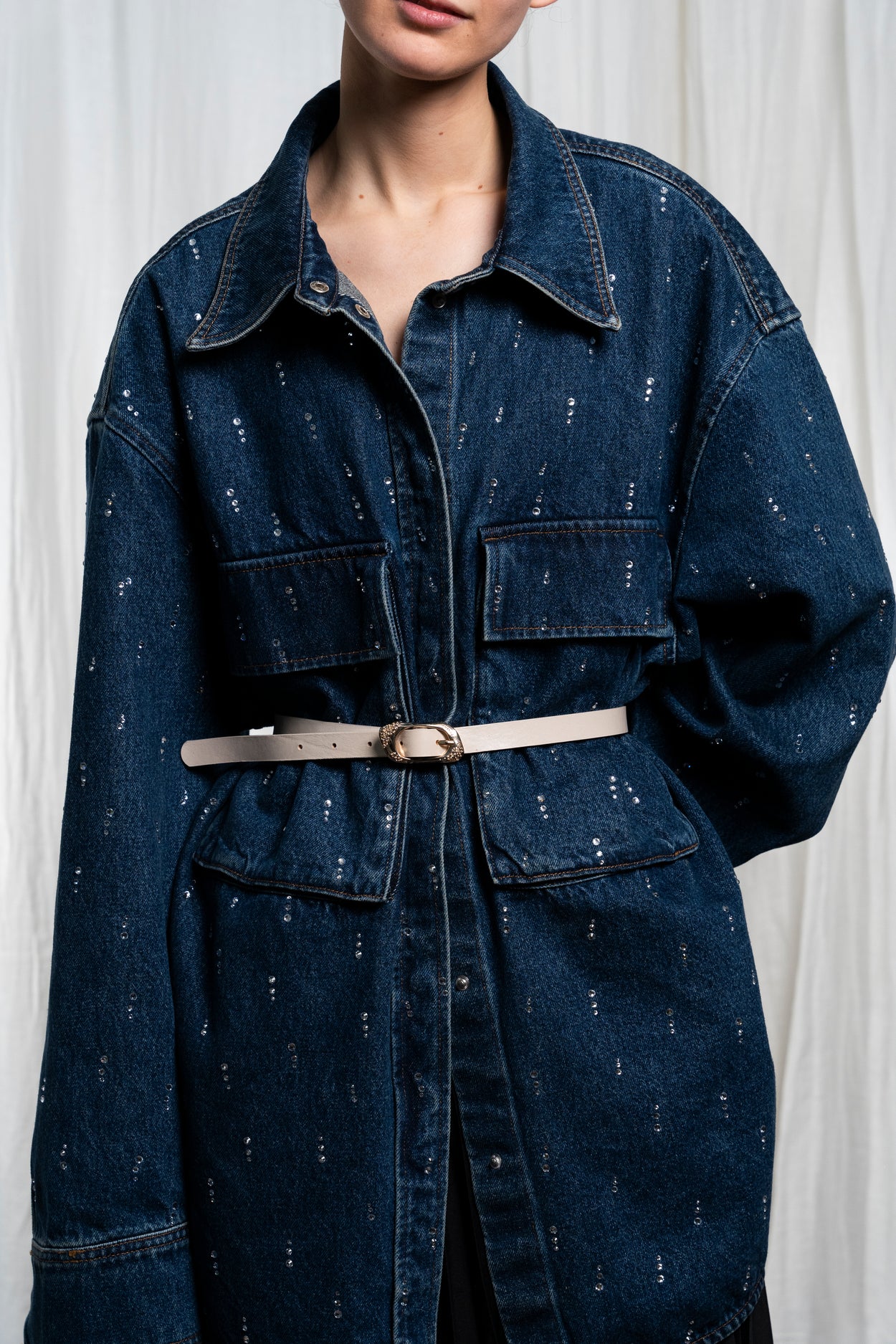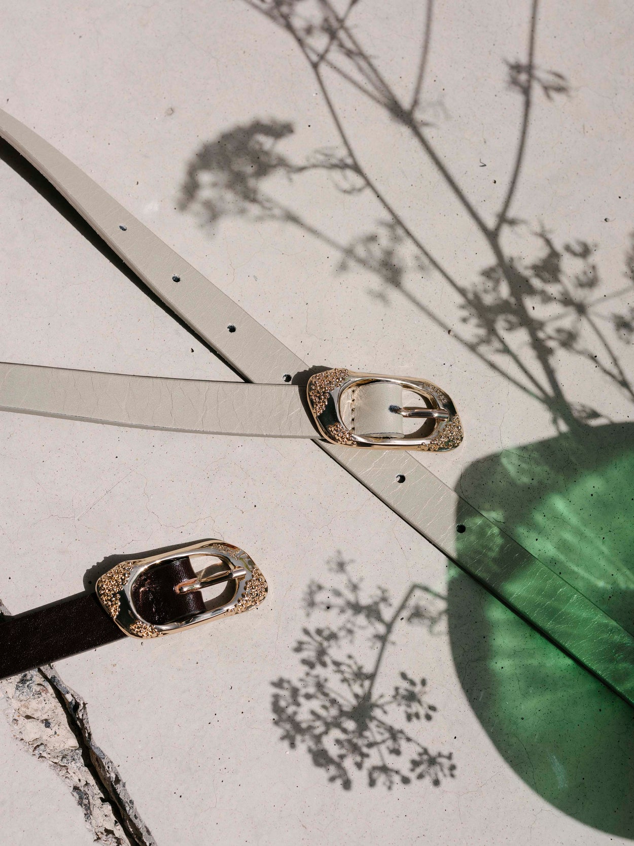 Nuevo cinturón BIM BIM realizado en piel vacuno de alta calidad en color piedra, elaborados artesanalmente en Valencia por una familia de cinturoneros. Hebilla dorada con diseño orgánico, exclusiva de JIMENAS, fabricada en Alicante.