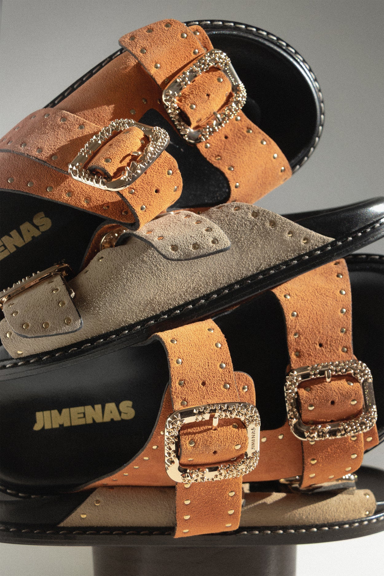 El modelo CARLOTA es un nuevo diseño muy especial realizado en una maravillosa piel de serraje anteado con toda la carga de ADN JIMENAS con micro tachas incrustadas. Llega para quedarse y acompañarnos en todos nuestros looks del día a día. Un modelo fácil, cómodo y todoterreno que hemos acompañado con un nuevo diseño de hebillas más rectangular exclusivo de JIMENAS, con nuestro trabajo de gotas y tachas en relieve, son auténticas piezas de joyería.