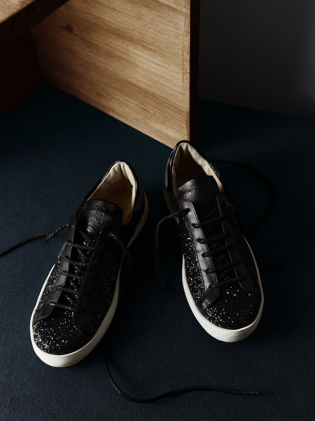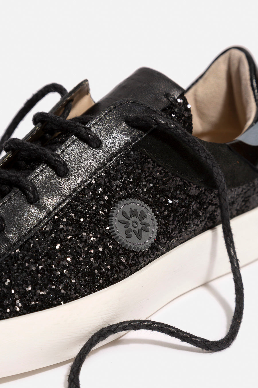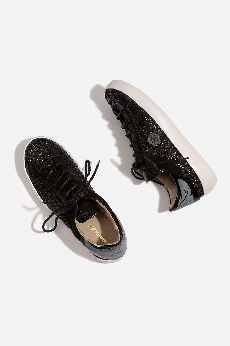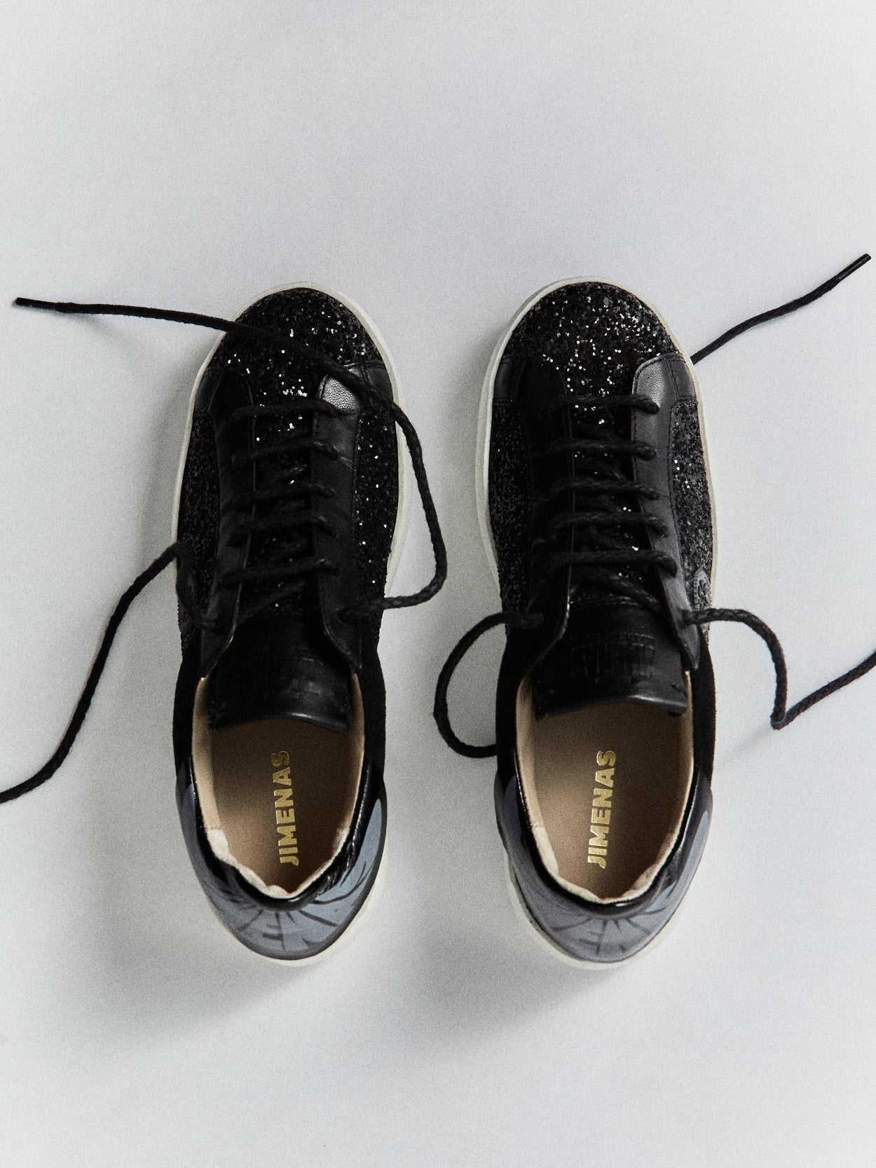 ENRIQUETA es la primera zapatilla diseñada en JIMENAS, una vuelta al clásico más puro en cuanto a líneas con un punto de tendencia en el glitter, te acompañará en tus looks más moda. Está realizada en una napa extra suave de alta calidad combinada con glitter español en color negro. Se combina con cordones rústicos encerados en negro, los mismos que usamos en el modelo Roman. Talonera en una piel glossy arrugada negra con el logo de JIMENAS en tamaño XL en gris antracita. Importante: El logo de la talonera en producción NO es gris claro, lo hemos ajustado a tono de la suela, en las fotos de la muestra se ve gris claro.