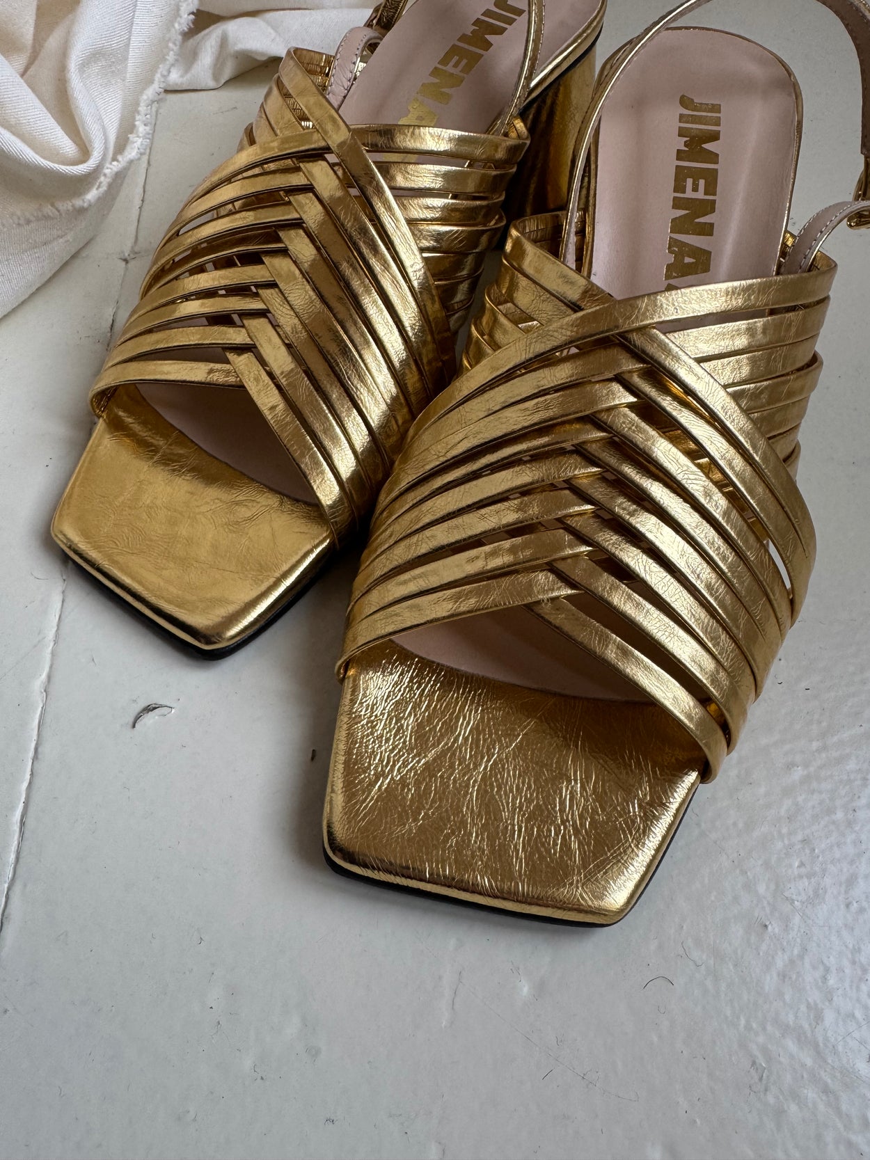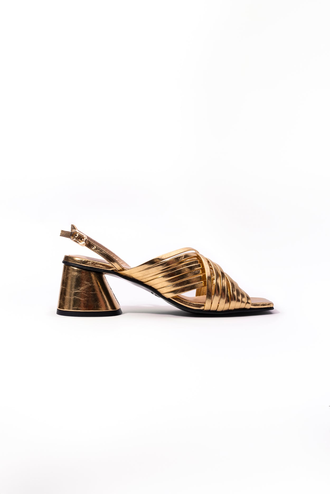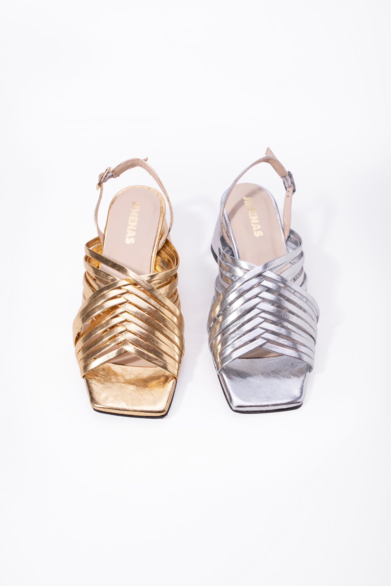 El acabado metalizado sobre piel es delicado y puede presentar desgaste con el uso, especialmente en zonas de roce o por el contacto con el sudor o el pH de la piel. No se considera un defecto de fabricación. Recomendamos conservar el calzado en su caja y evitar superficies abrasivas.