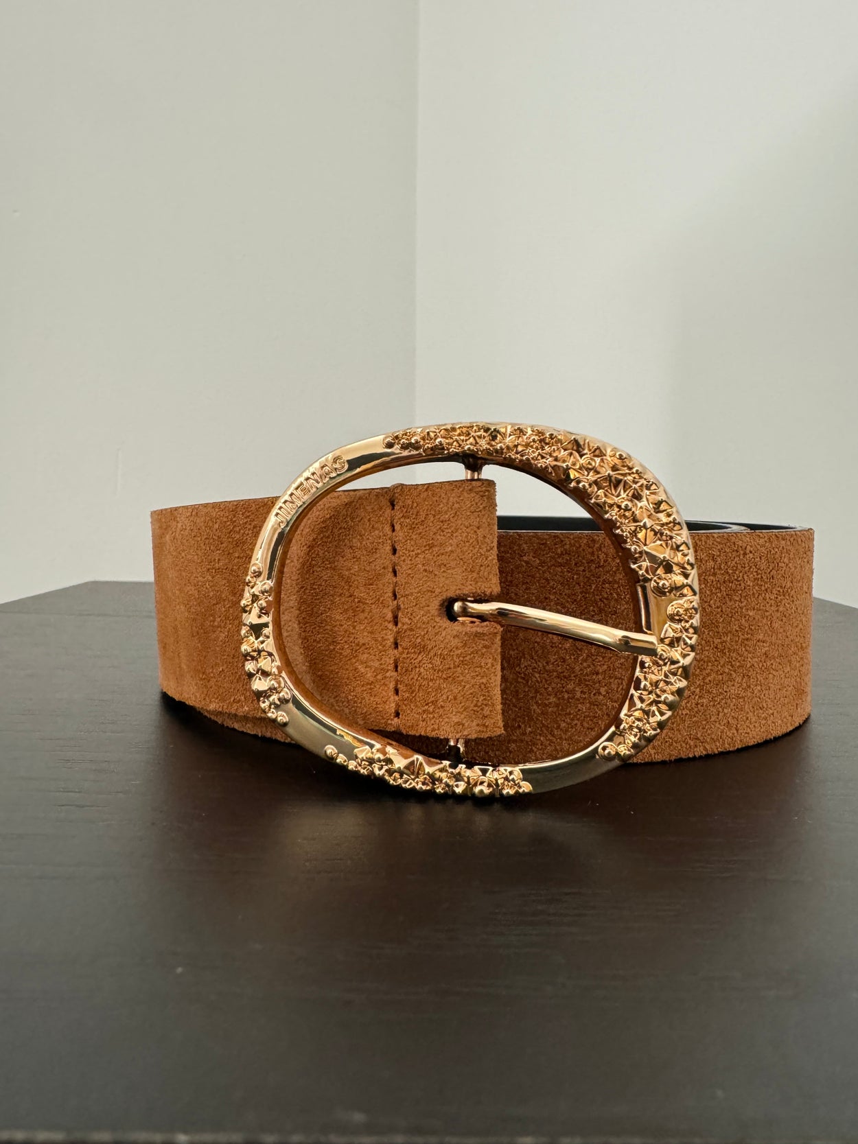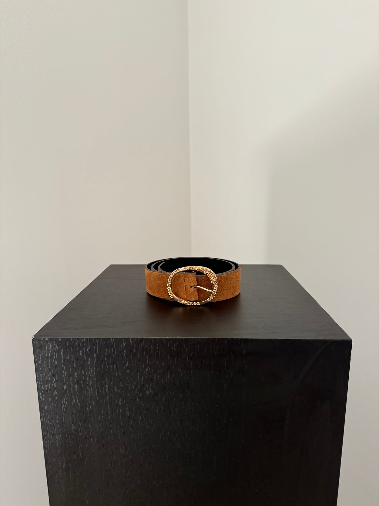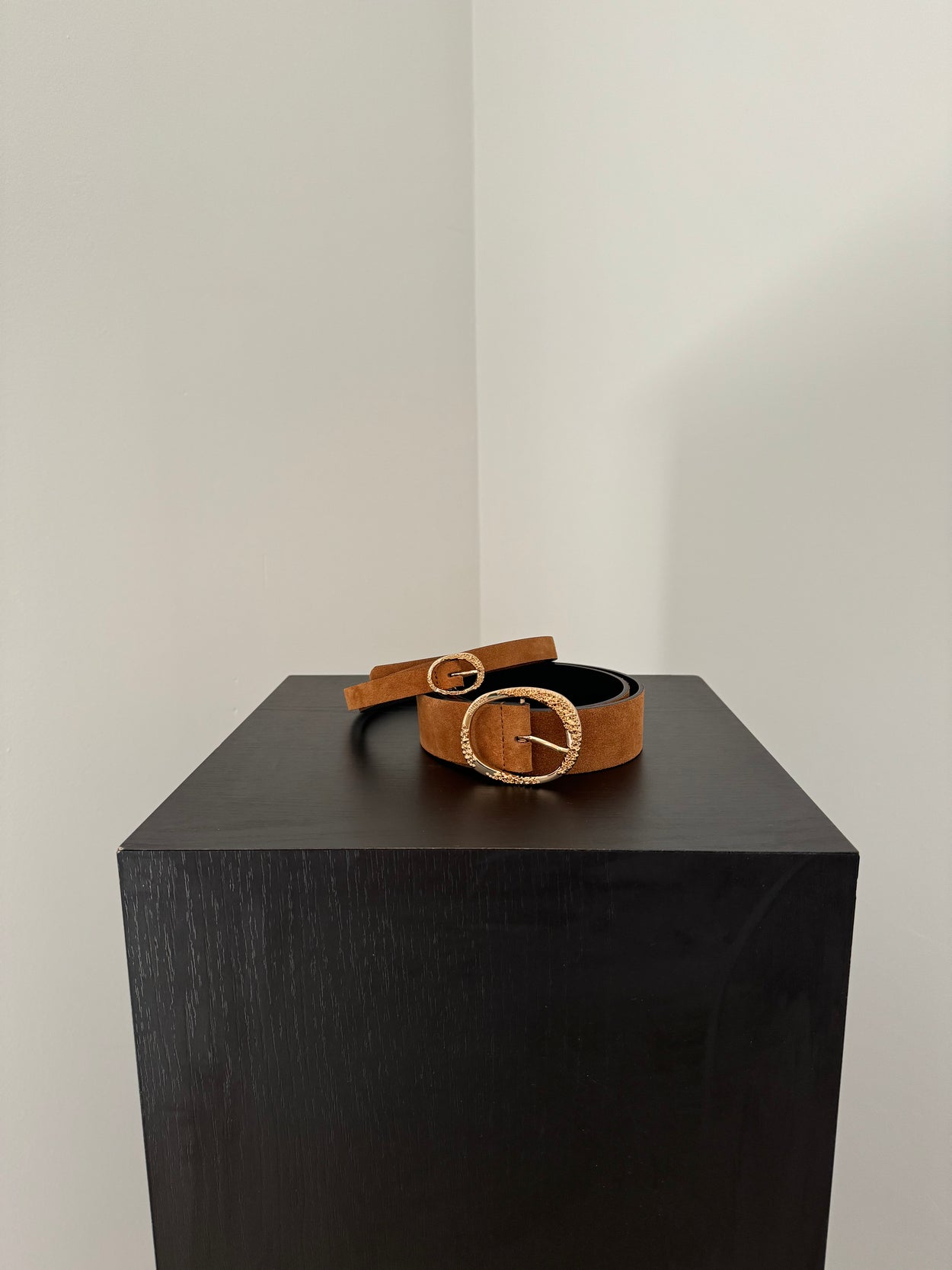 Cinturón MATILDE realizado en piel vacuno de alta calidad en acabado serraje cognac elaborados artesanalmente en Valencia por una familia de cinturoneros. Hebilla dorada exclusiva de JIMENAS fabricada en Alicante.