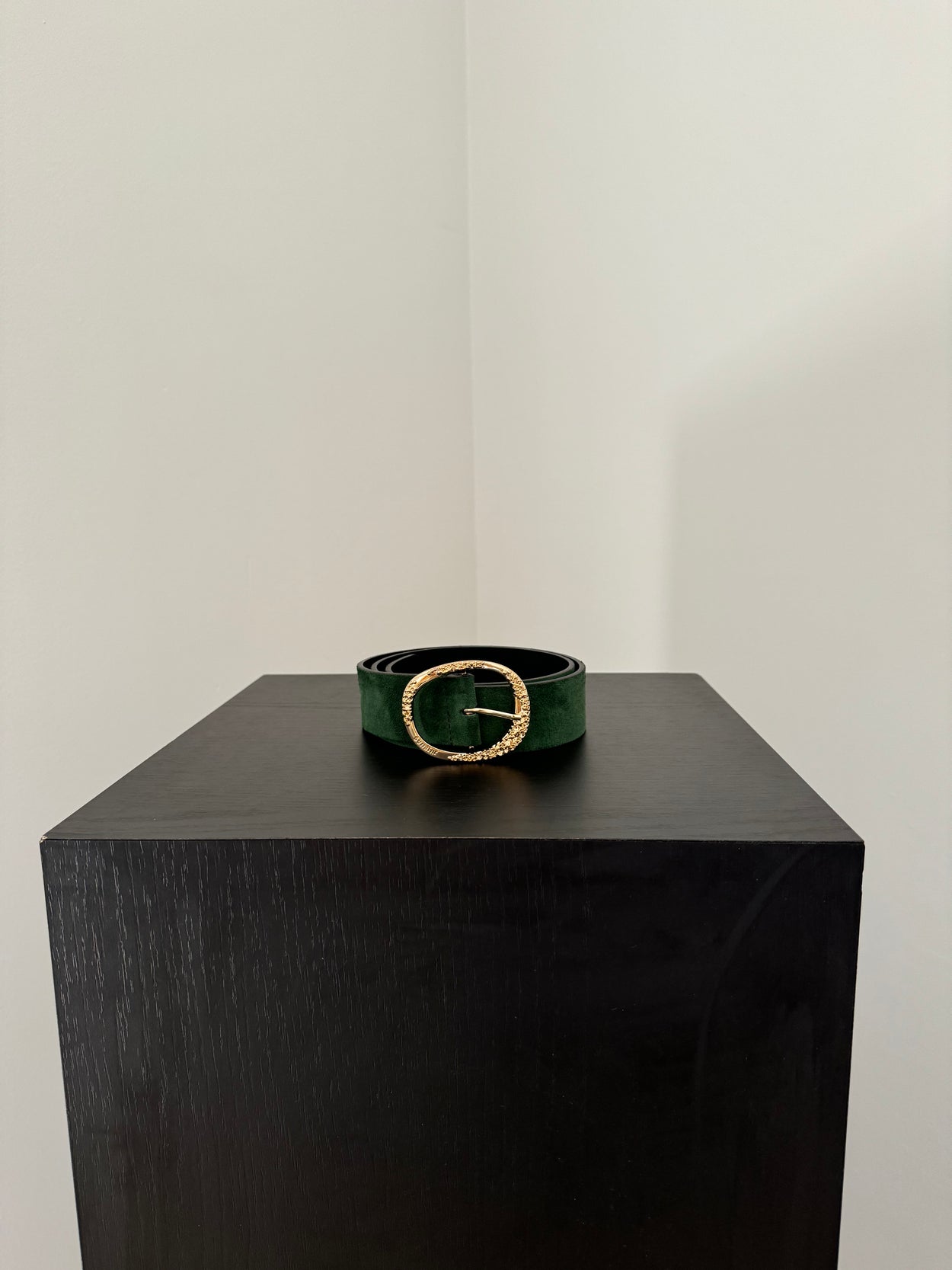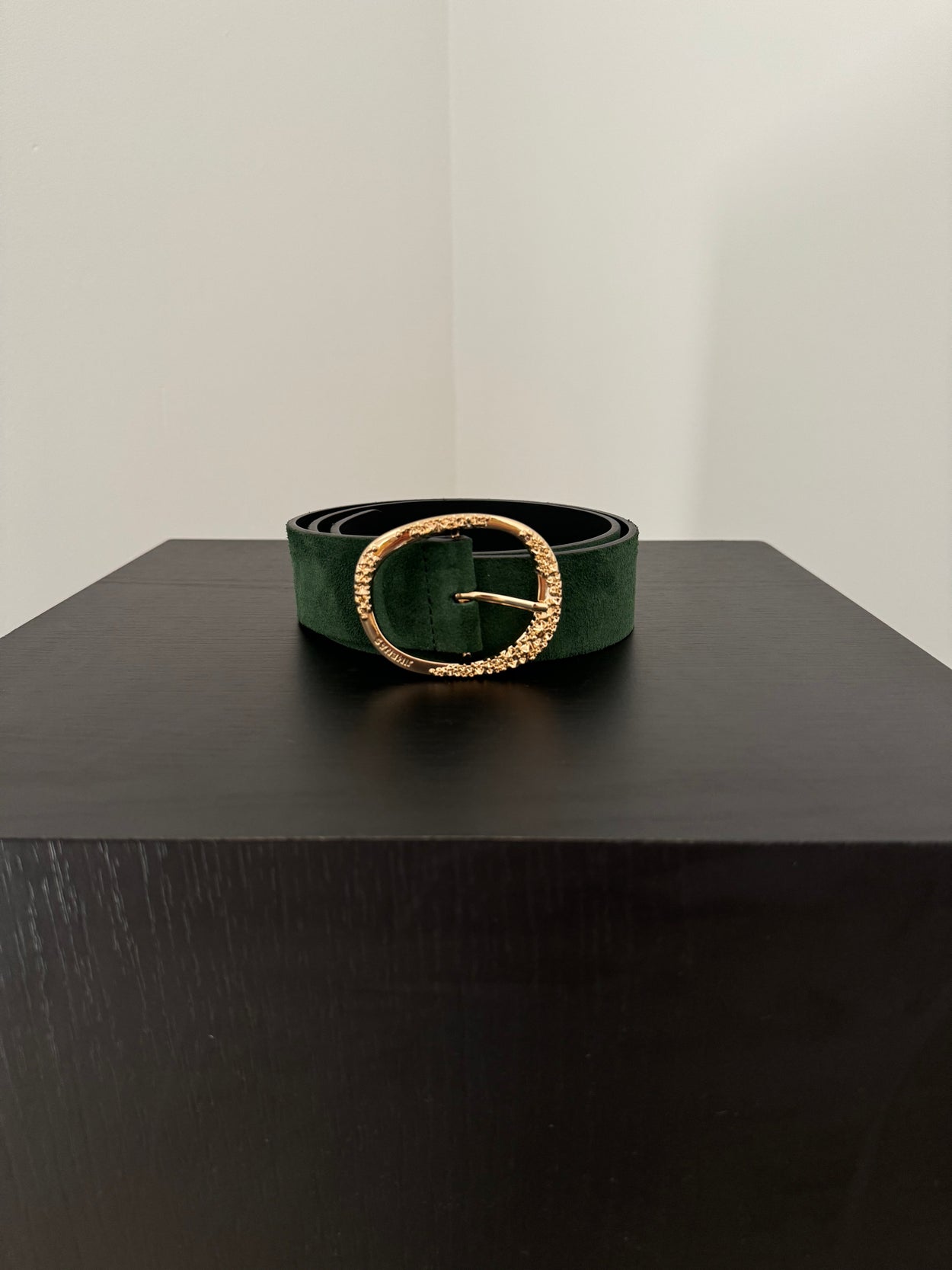 Cinturón MATILDE realizado en piel vacuno de alta calidad en serraje verde elaborados artesanalmente en Valencia por una familia de cinturoneros. Cantos en negro tintados con pincel a mano. Hebilla dorada exclusiva de JIMENAS fabricada en Alicante.