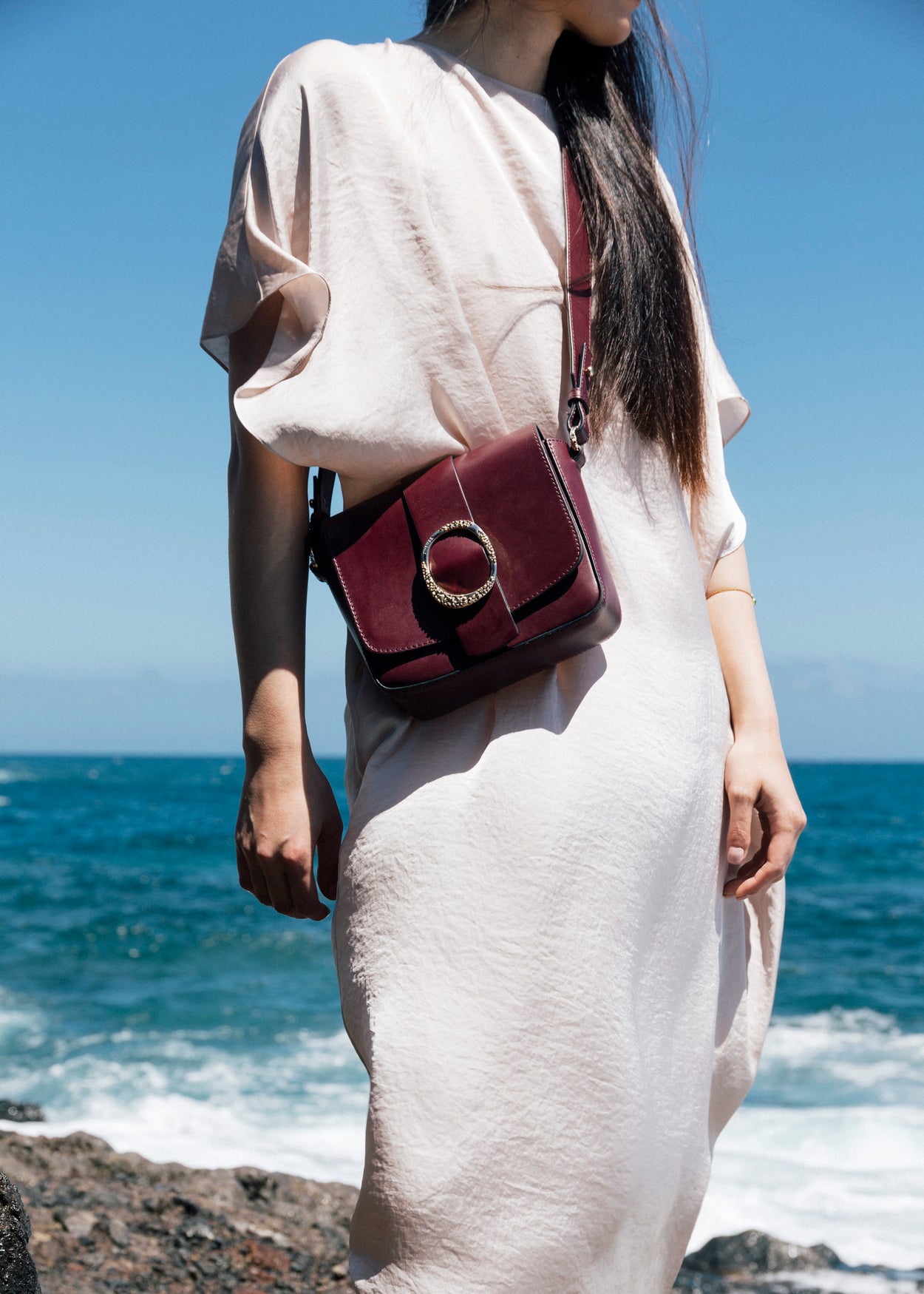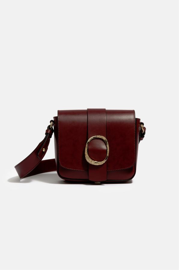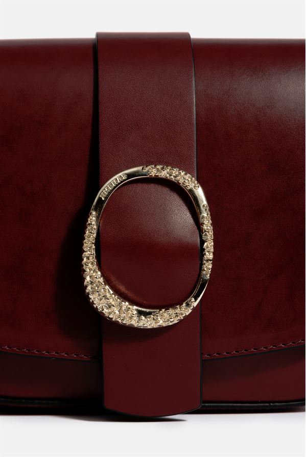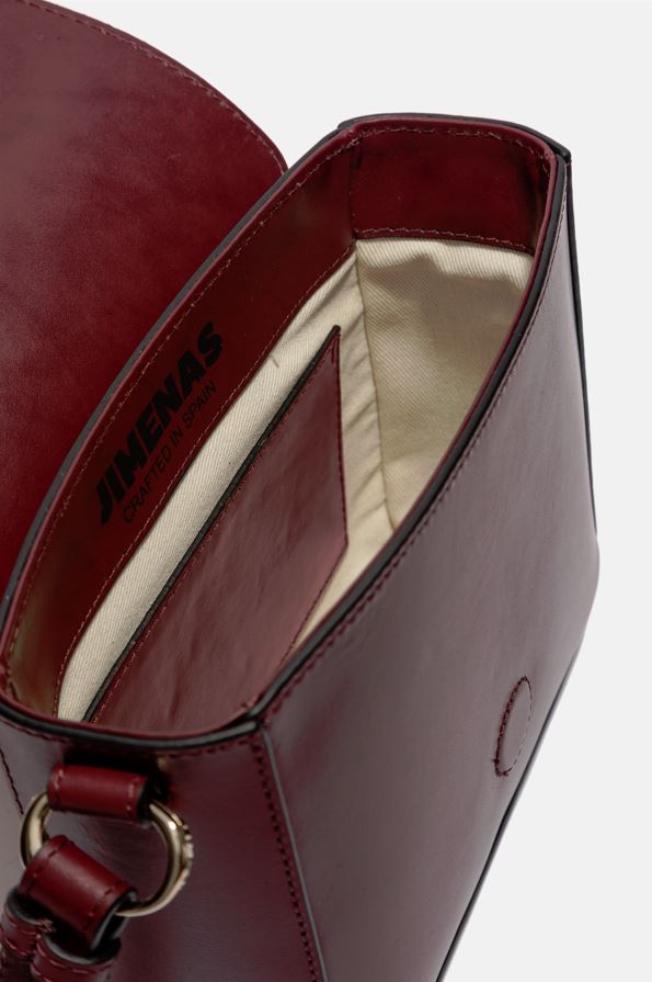 Bandolera realizada en piel vacuno de alta calidad en piel premium color vino con aguas. Cierre oculto de imán de máxima fuerza en vista interior. Forro interno en mezcla de algodón. Bolsillo interior de piel. Logo grabado con tinta blanca en la vista interior. Cantos a contraste tintados en negro con pincel a mano. Hebillas diseño exclusivo de JIMENAS en acabado oro tenue.