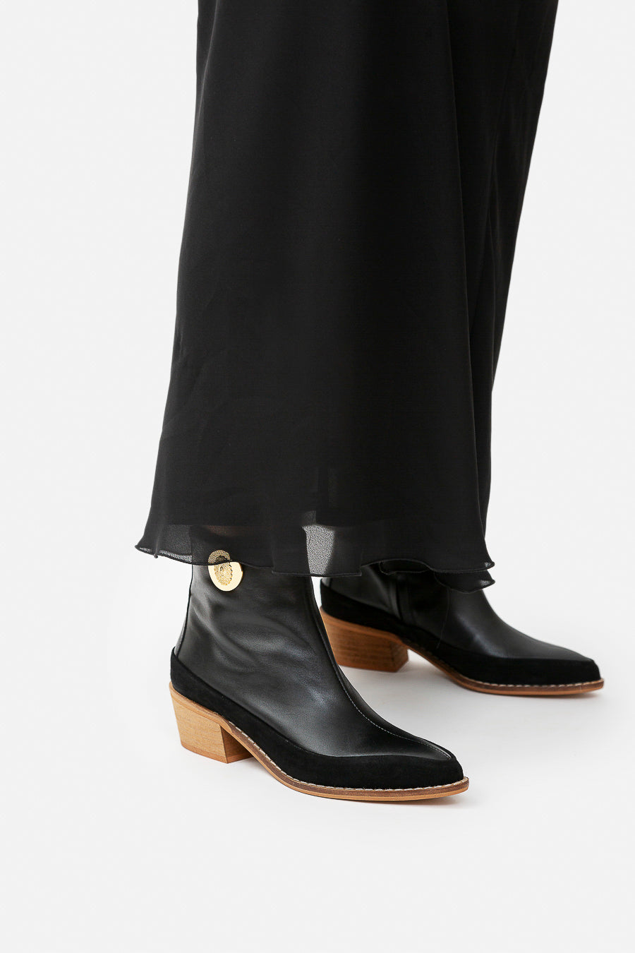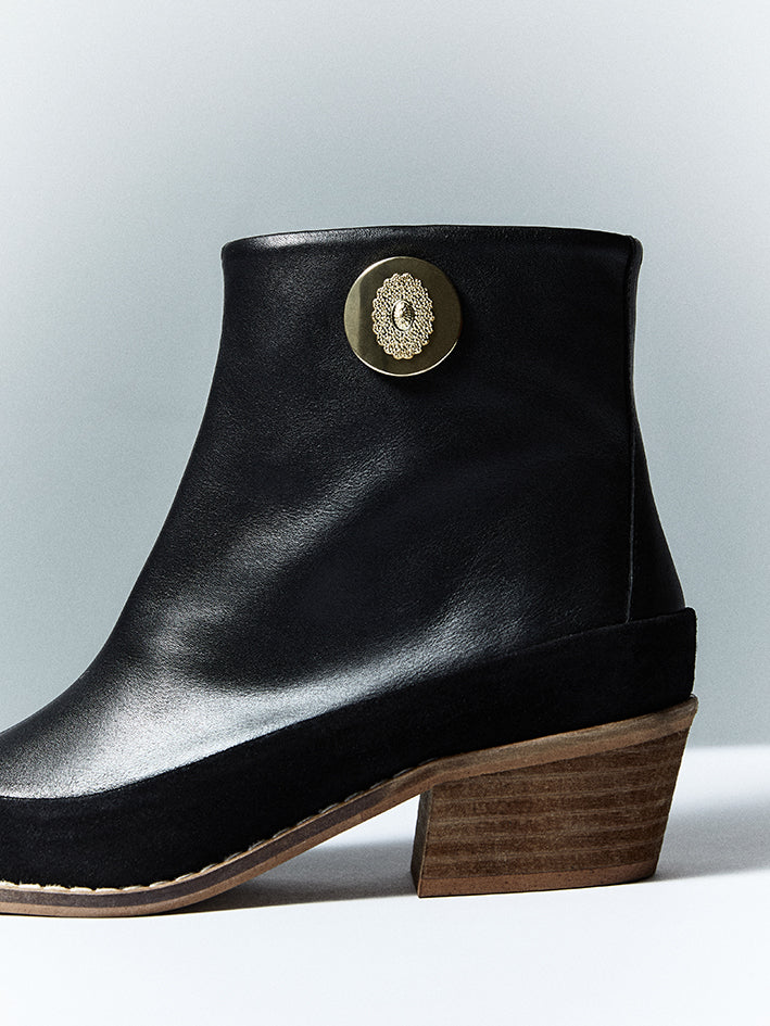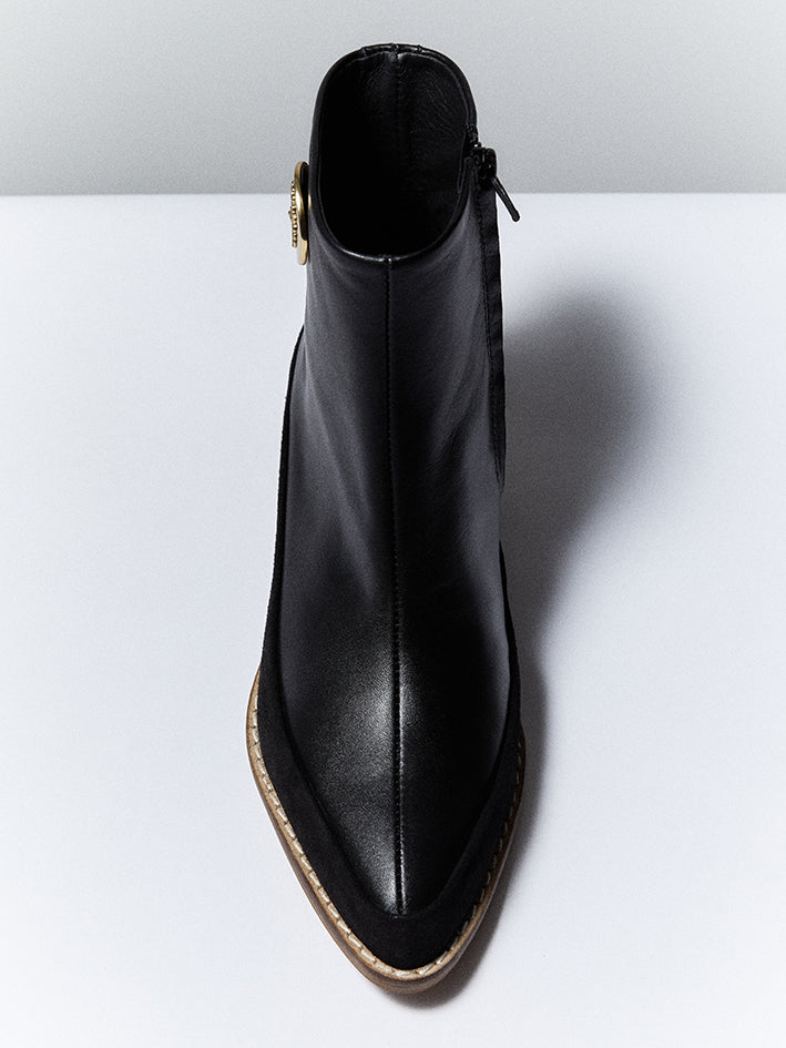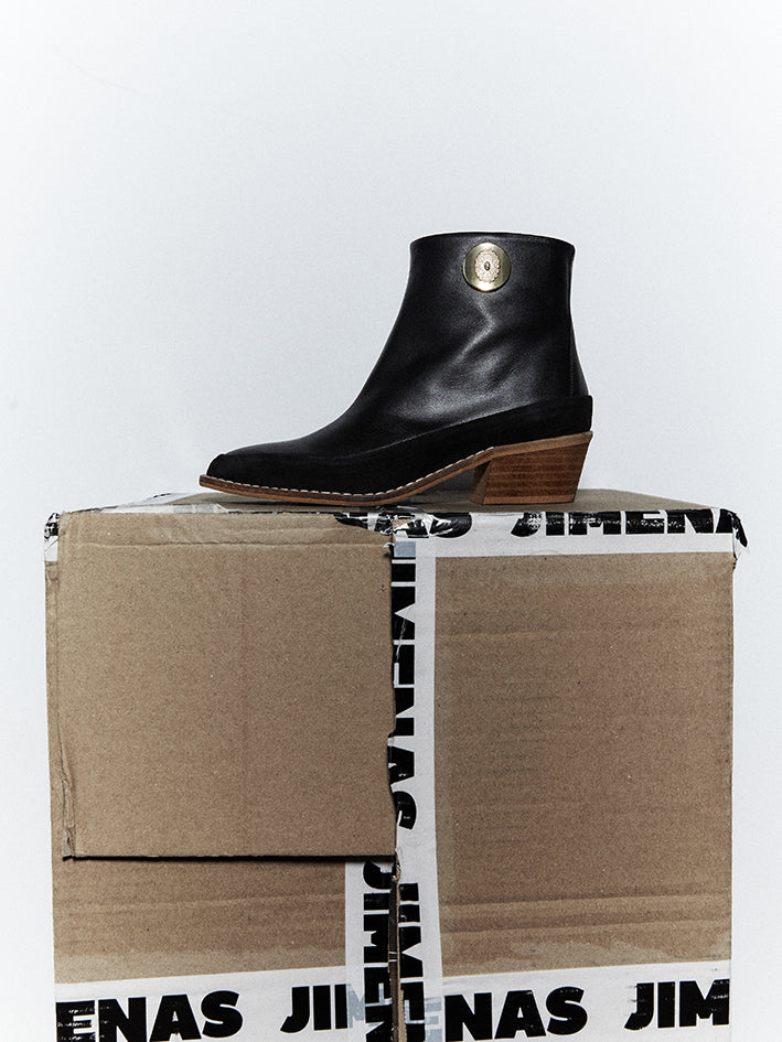 RAMONA es nuestro primer botín desarrollado en JIMENAS. Una obra de artesanía delicada en mezcla de materiales. Realizado enteramente en napa de altísima calidad con vivo vuelto en ante de alta calidad. Cerco cosido en hilo zapatero envejecido en crema. Cremallera interior YKK. Apto para tobillo ancho. El toque de luz lo conseguimos con nuestro nuevo chapón lateral diseño exclusivo de JIMENAS.