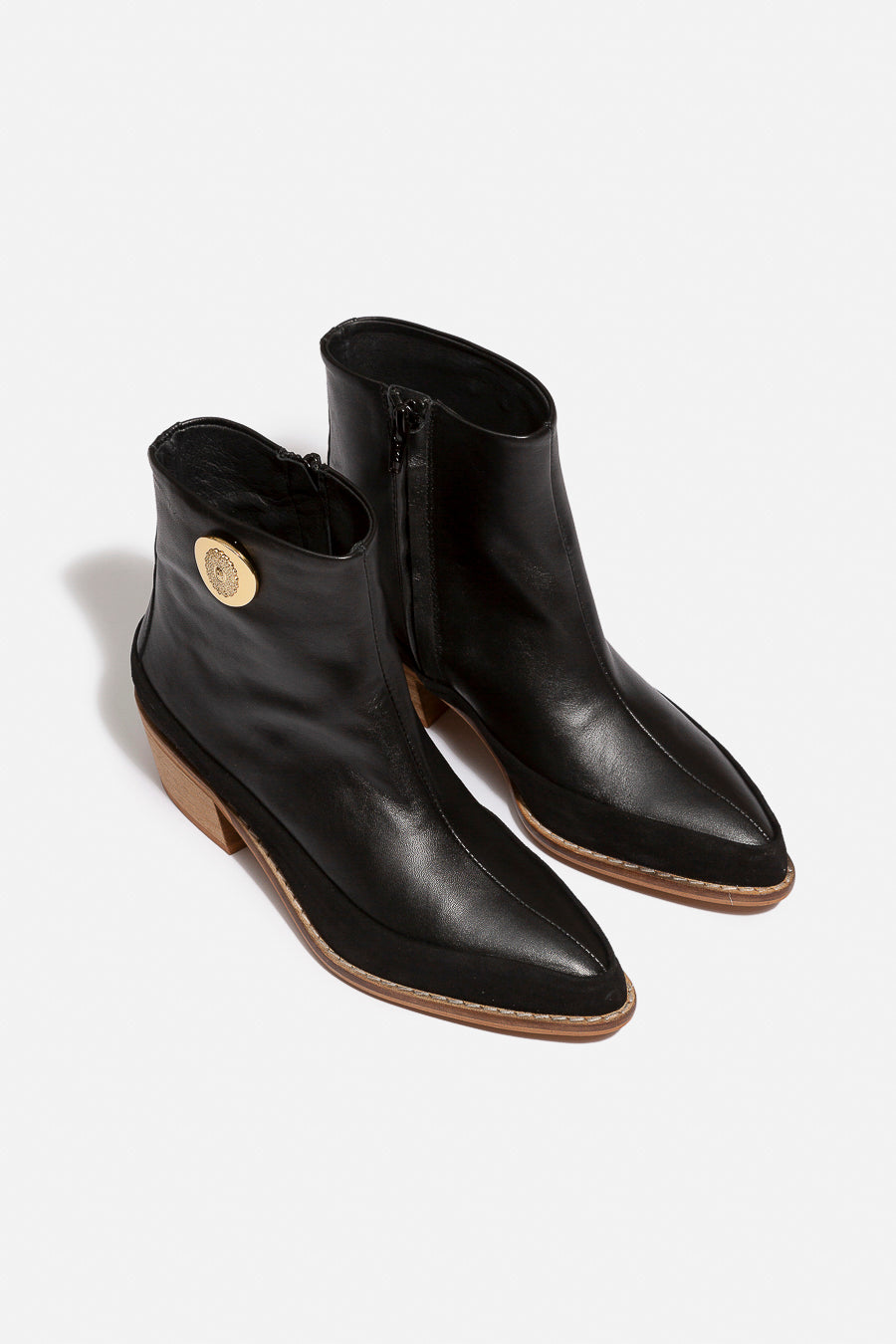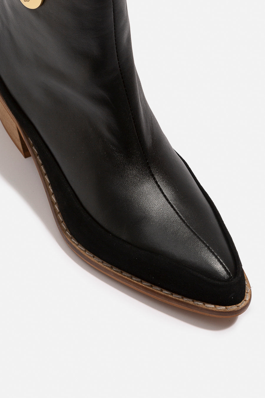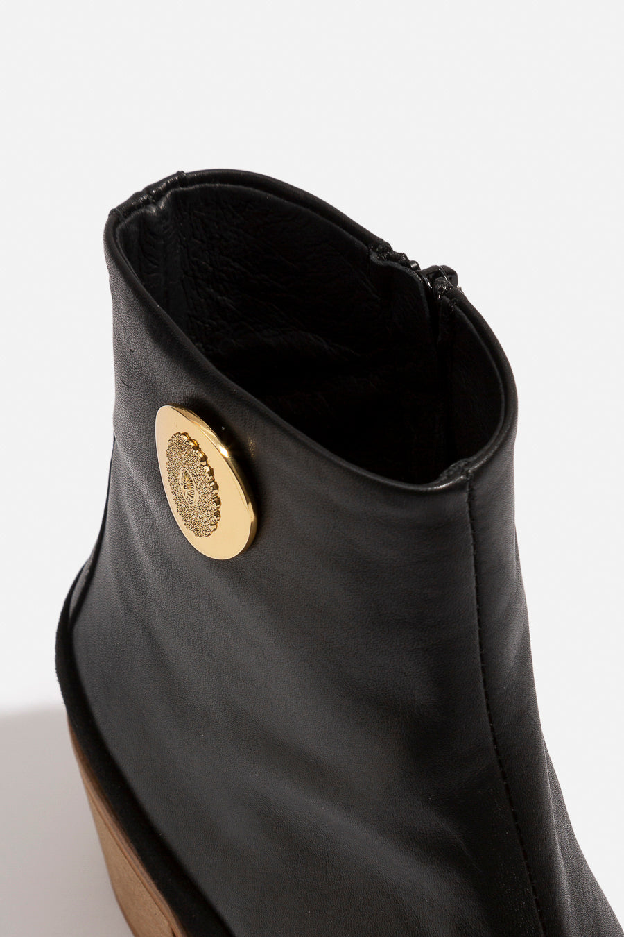RAMONA es nuestro primer botín desarrollado en JIMENAS. Una obra de artesanía delicada en mezcla de materiales. Realizado enteramente en napa de altísima calidad con vivo vuelto en ante de alta calidad. Cerco cosido en hilo zapatero envejecido en crema. Cremallera interior YKK. Apto para tobillo ancho. El toque de luz lo conseguimos con nuestro nuevo chapón lateral diseño exclusivo de JIMENAS.