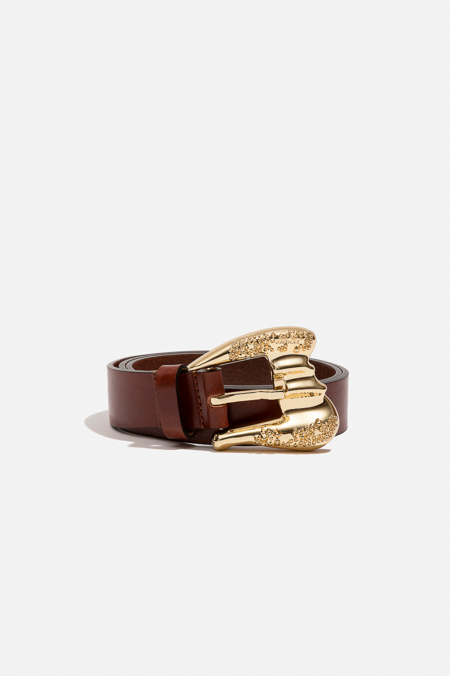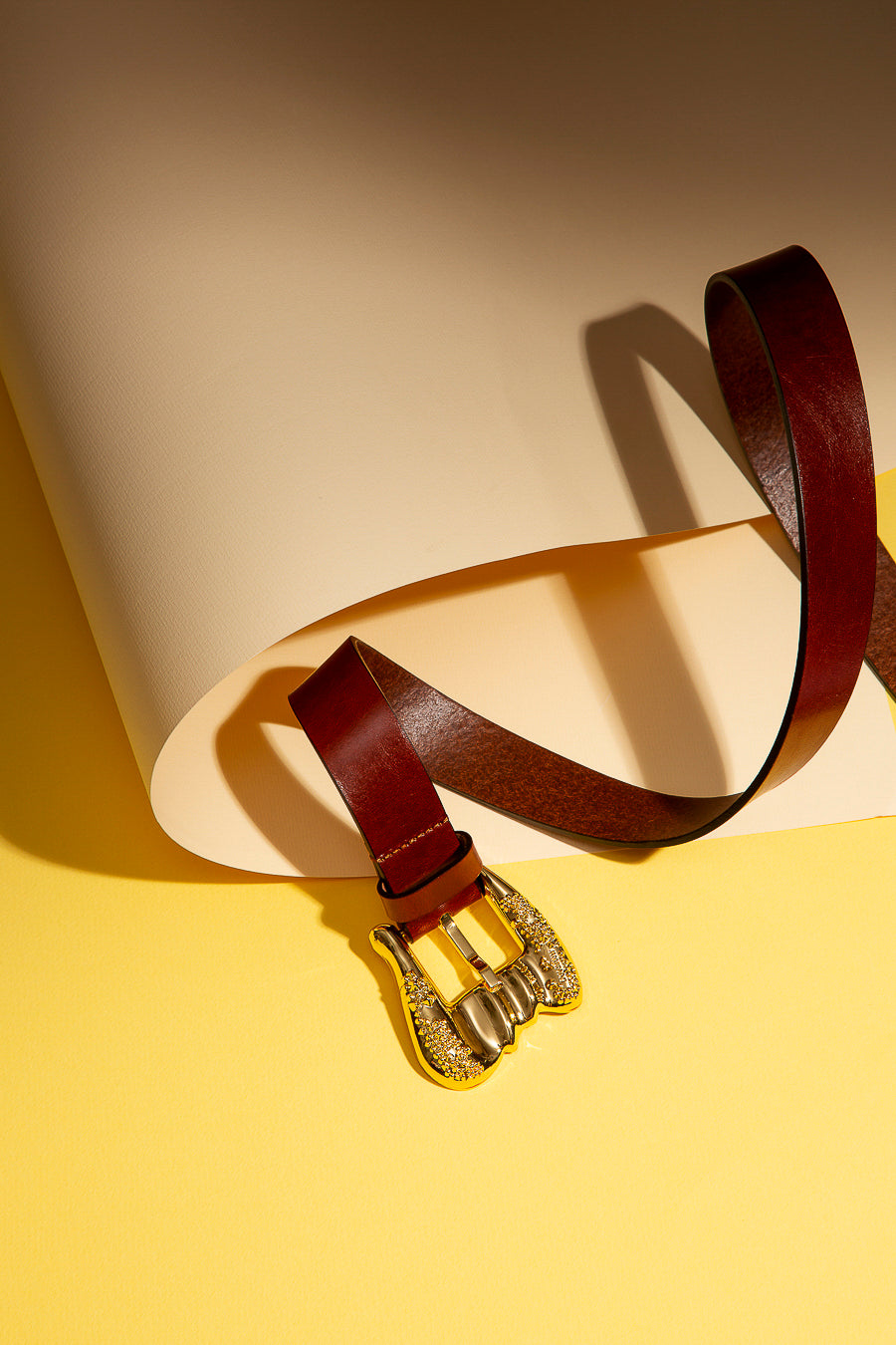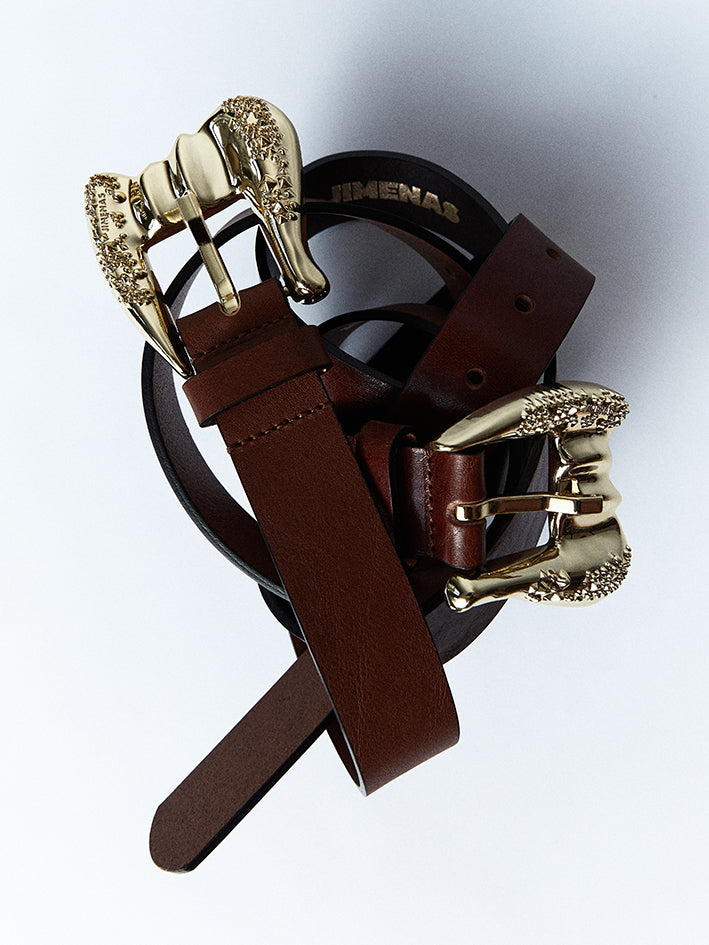 Cinturón SIMONA realizado en piel vacuno de alta calidad en color chocolate. Elaborados artesanalmente en Valencia por una familia de cinturoneros. Nueva hebilla dorada diseño exclusivo de JIMENAS fabricada en Alicante.