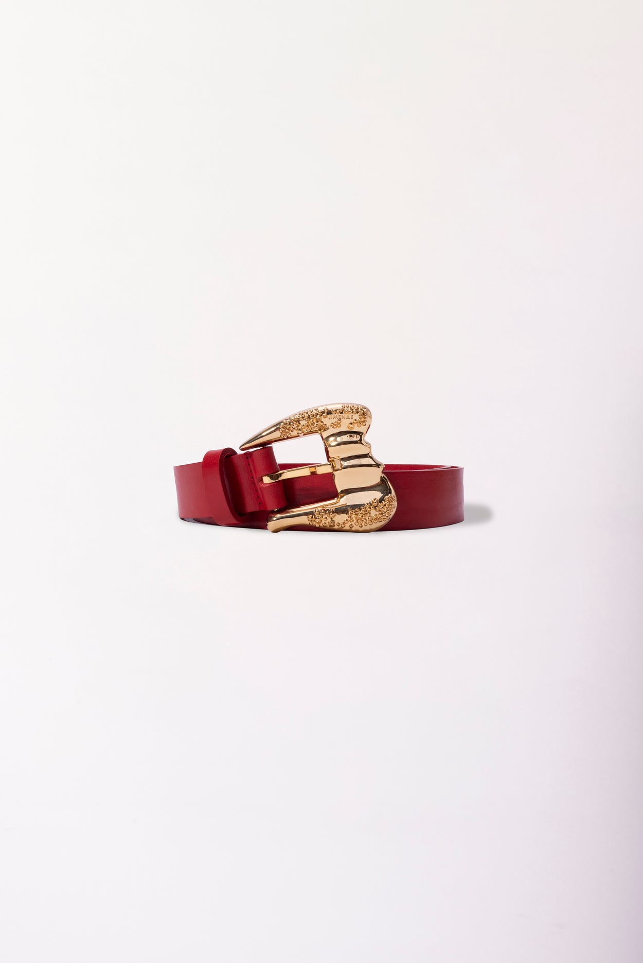 Cinturón SIMONA realizado en piel vacuno color rojo elaborado artesanalmente en Valencia por una familia de cinturoneros. Hebilla dorada exclusiva de JIMENAS fabricada en Alicante.
