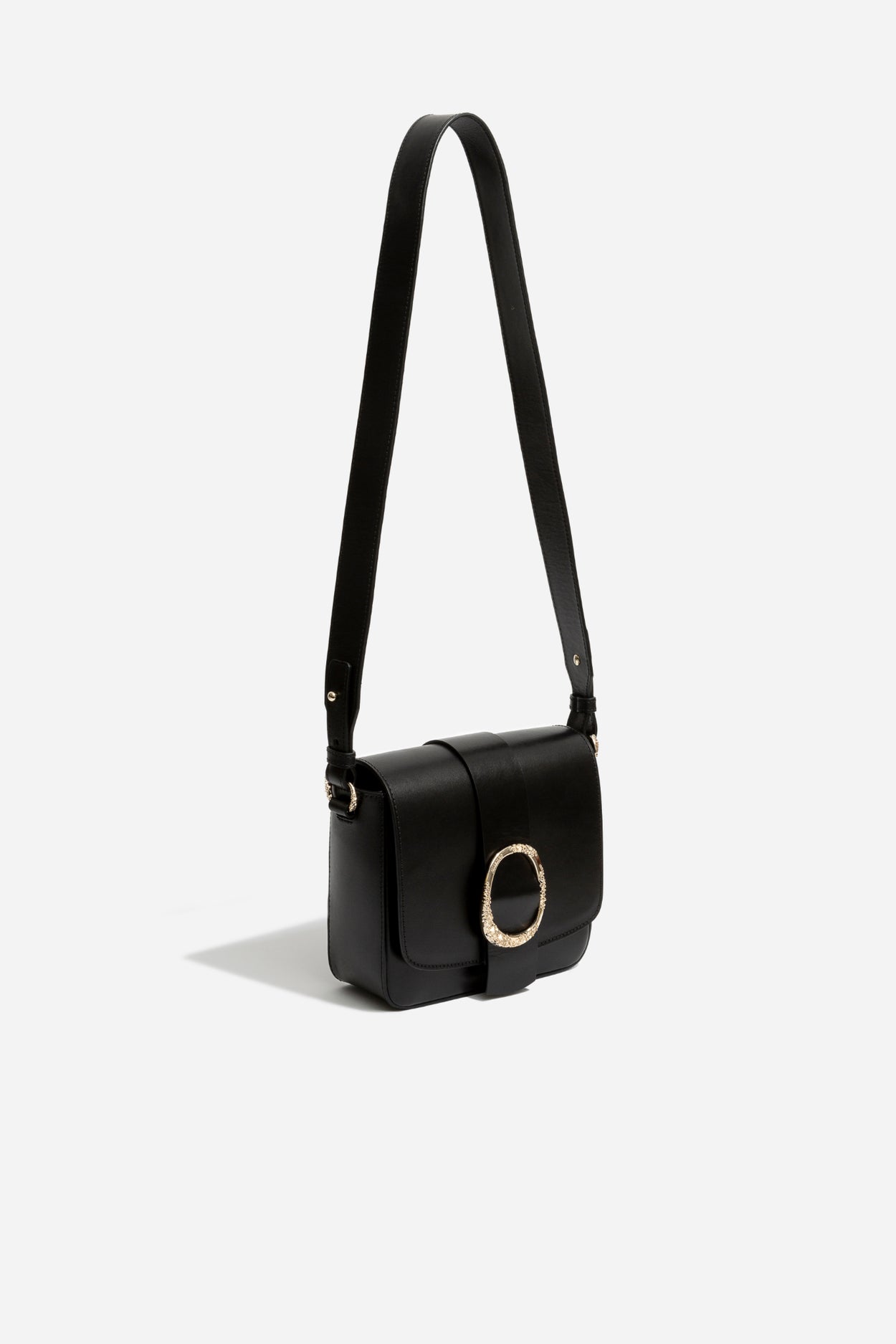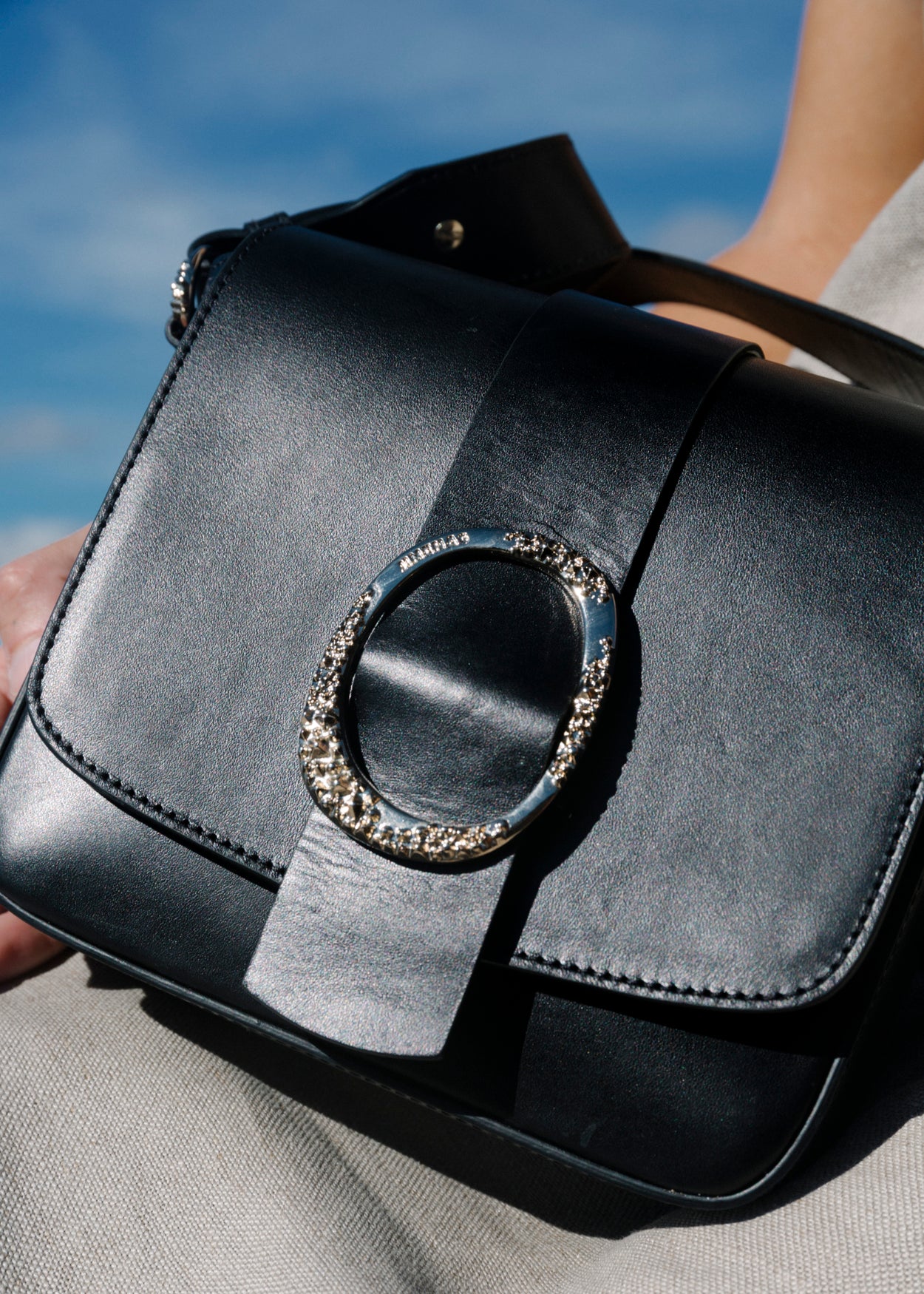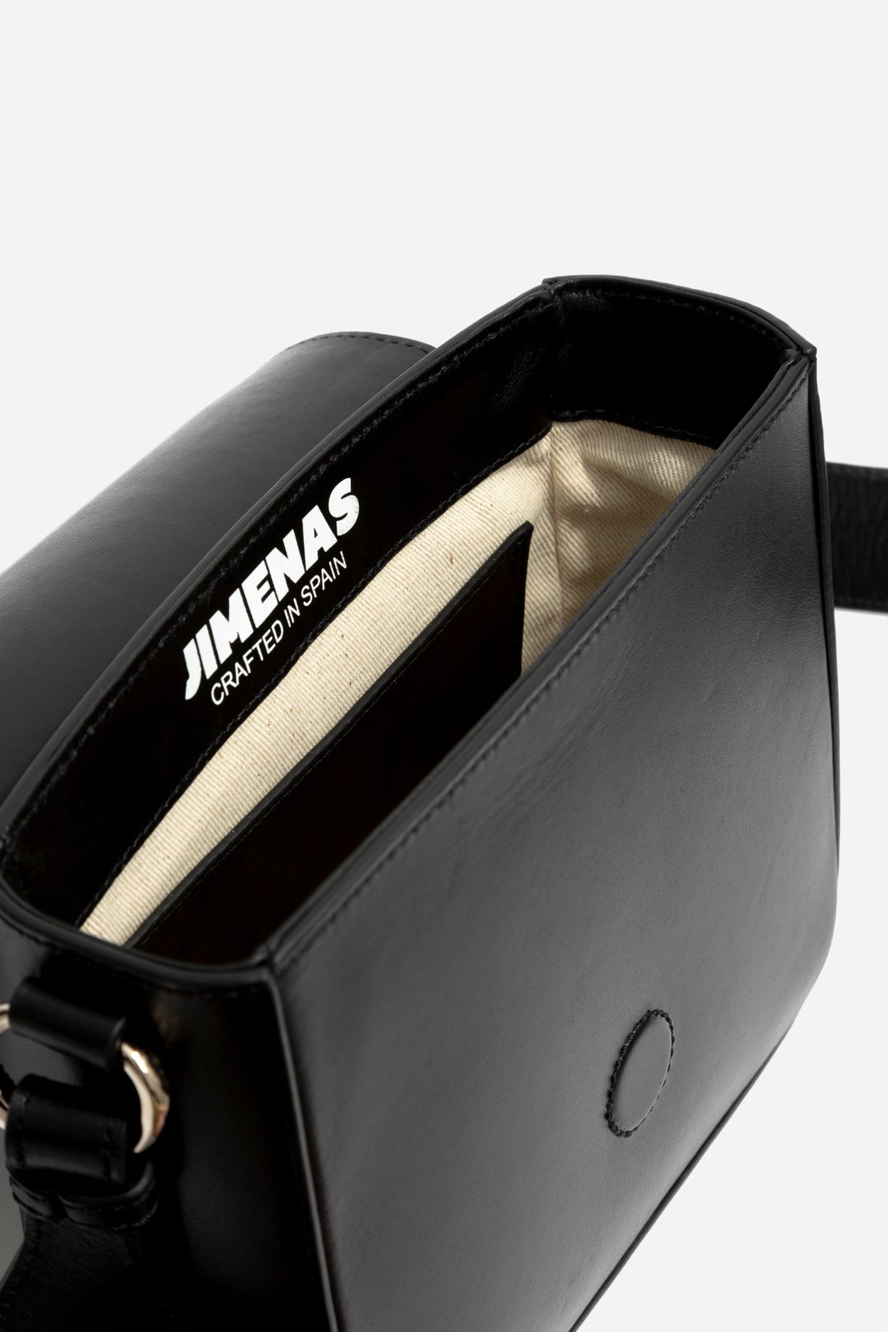 Bandolera realizada en piel vacuno de alta calidad. Cierre oculto de imán de máxima fuerza en vista interior. Forro interno en mezcla de algodón. Bolsillo interior de piel. Logo grabado con tinta blanca en la vista interior y exterior a fuego. Cantos a contraste tintados en negro con pincel a mano. Hebillas diseño exclusivo de JIMENAS en acabado oro tenue.