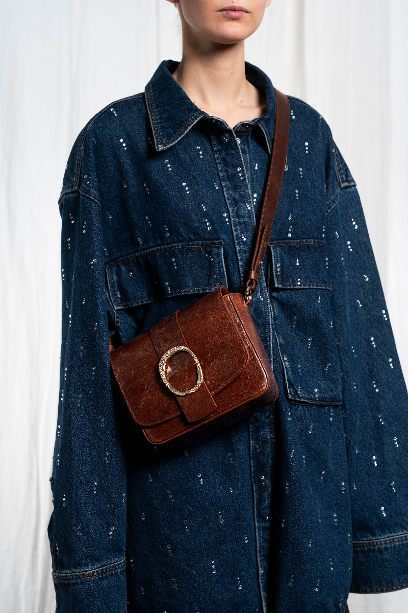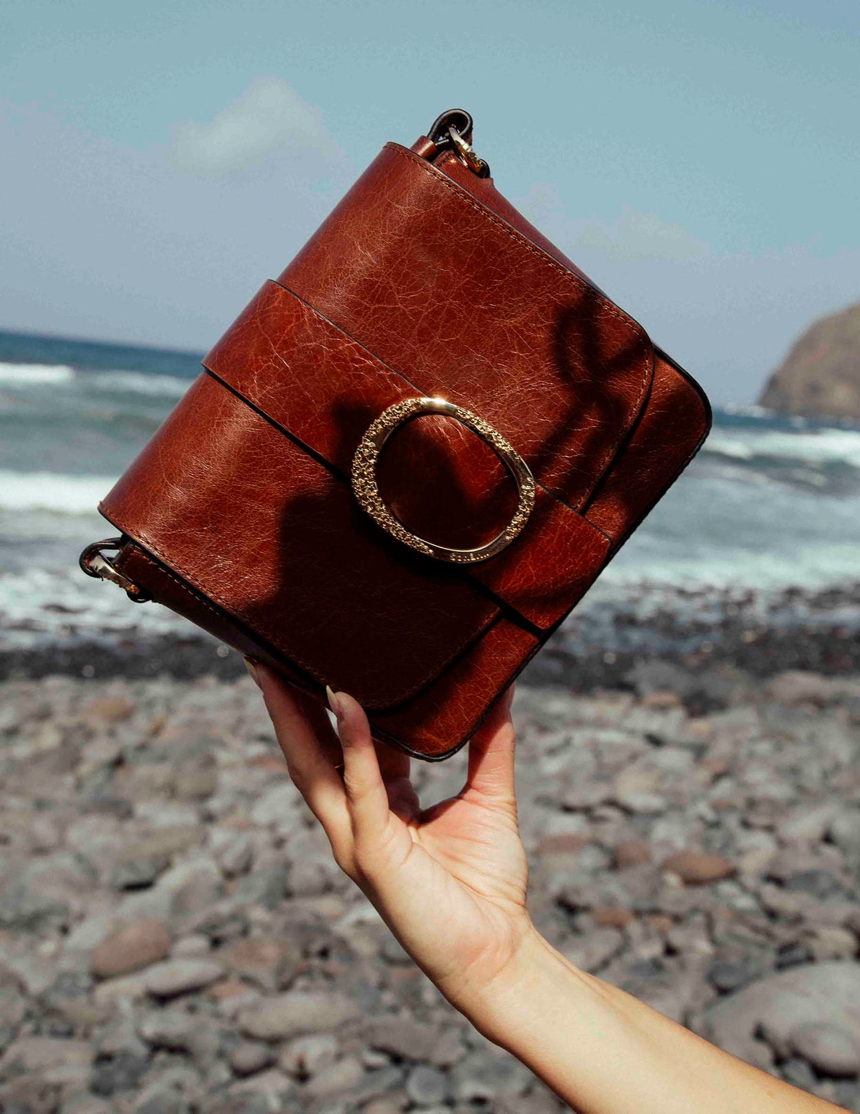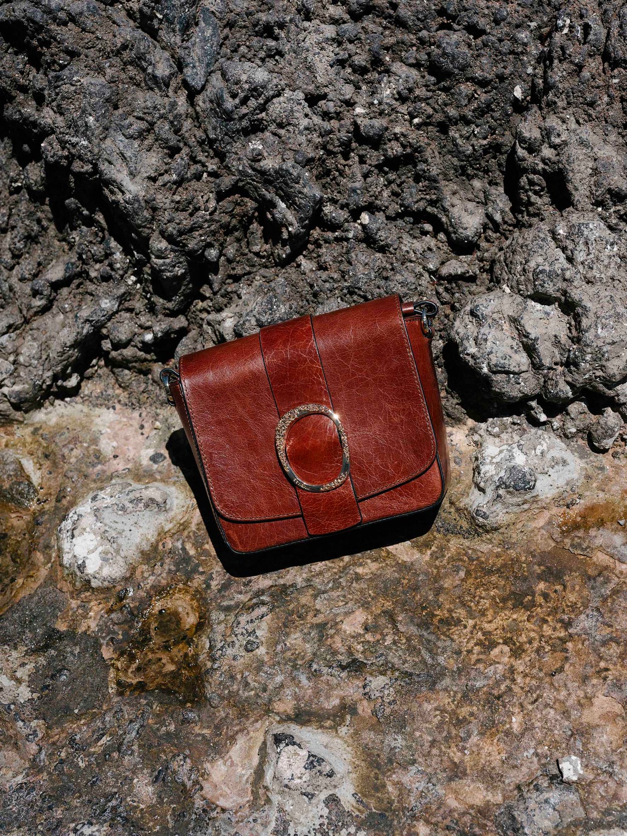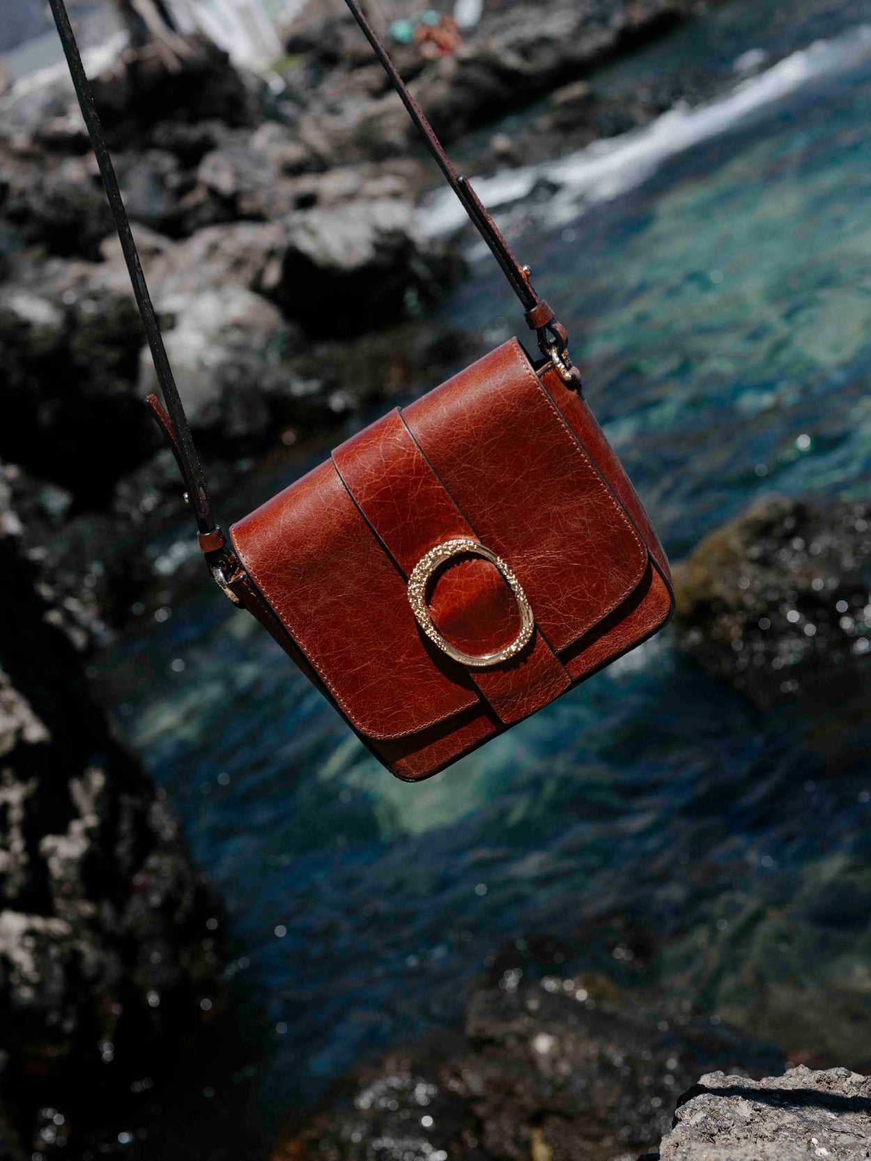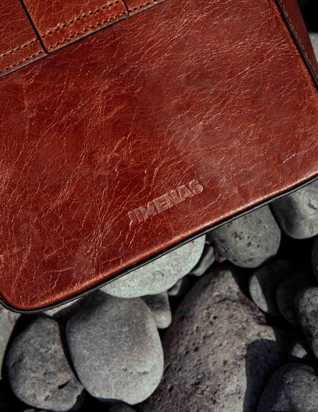 Bandolera realizada en piel vacuno de alta calidad en piel premium color castagna . Cierre oculto de imán de máxima fuerza en vista interior. Forro interno en mezcla de algodón. Bolsillo interior de piel. Logo grabado con tinta blanca en la vista interior. Cantos a contraste tintados en negro con pincel a mano. Hebillas diseño exclusivo de JIMENAS en acabado oro tenue.