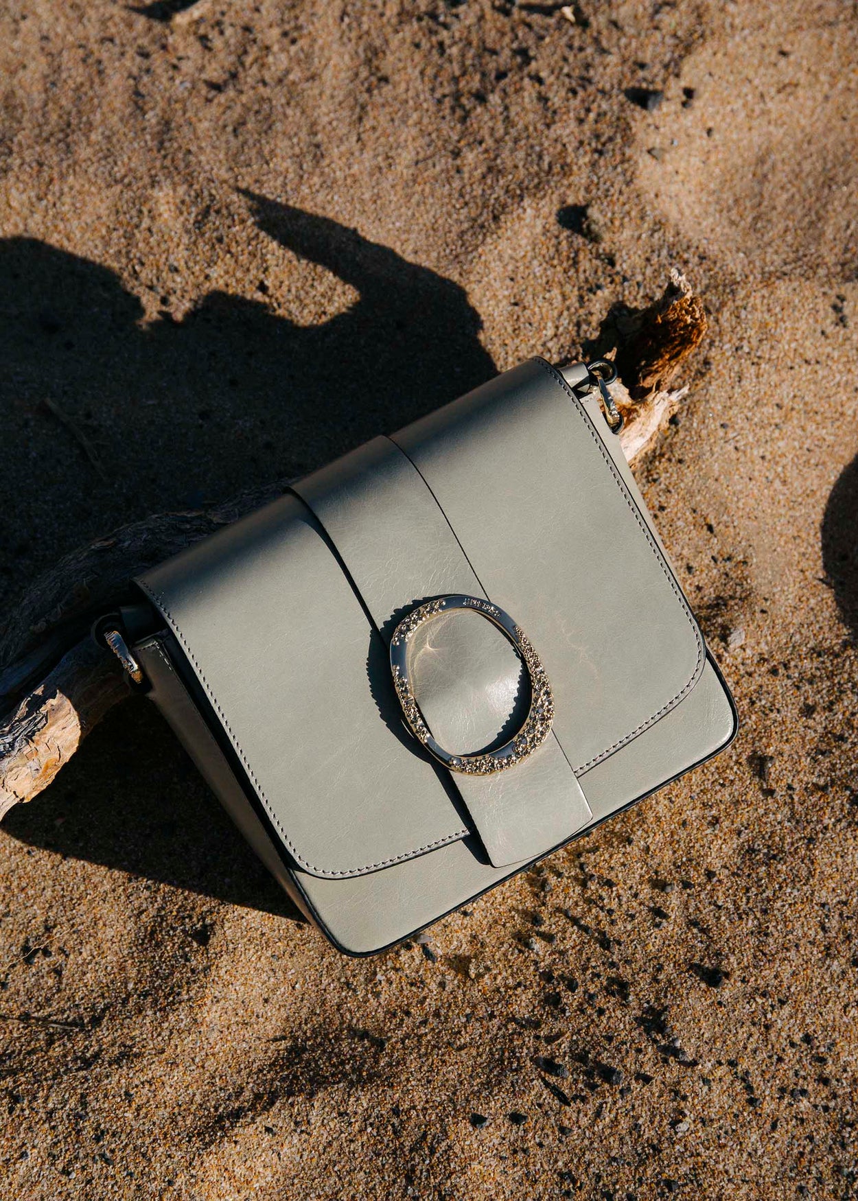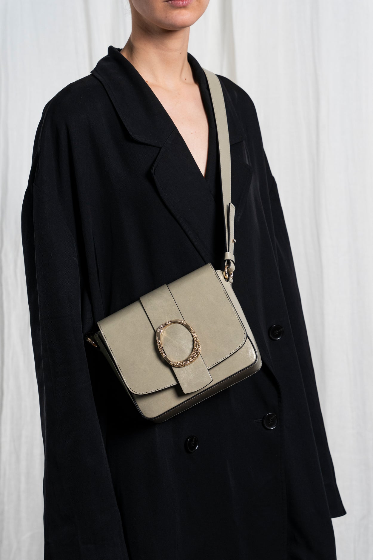 Bandolera realizada en piel vacuno de alta calidad en piel premium color pomice . Cierre oculto de imán de máxima fuerza en vista interior. Forro interno en mezcla de algodón. Bolsillo interior de piel. Logo grabado con tinta blanca en la vista interior. Cantos a contraste tintados en negro con pincel a mano. Hebillas diseño exclusivo de JIMENAS en acabado oro tenue.