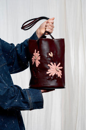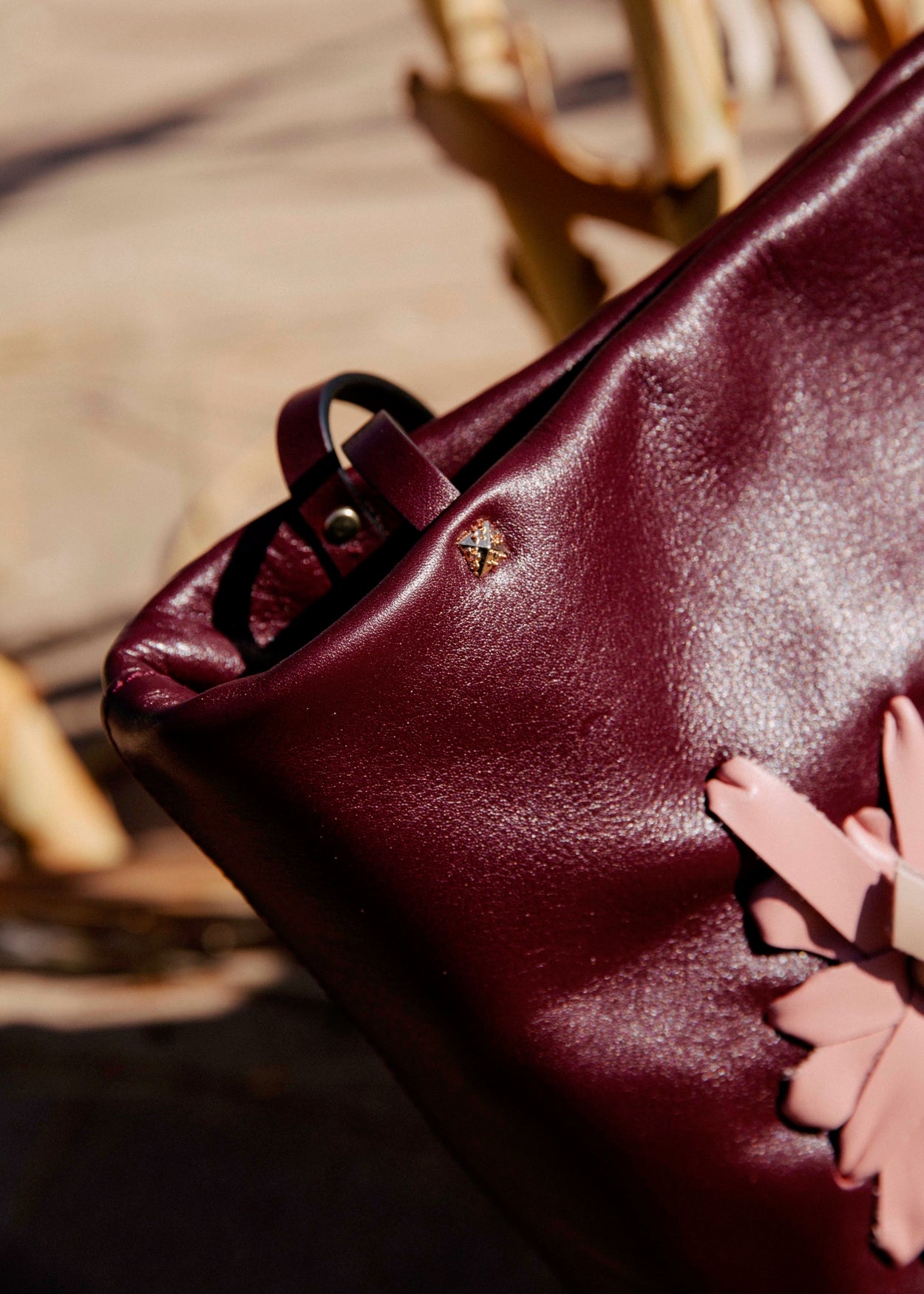 El trenzado de la placa de este modelo se hace enteramente por las manos de Pedro, pasando cada tira de forma individual hasta construir el diseño original. Nuestro trenzador especialista cuenta con una experiencia de una vida entera dedicada a la artesanía más pura con sus manos. La mezcla de piel acharolada y napas en diferentes tonos suben de forma superpuestas sobre el frontal en piel de vacuno de alta calidad en un ya icónico color vino, emblema de la casa. El toque de luz lo dan 4 tachas diseñadas en exclusiva por JIMENAS que coronan cada una de las asas. El ancho fino de las asas respeta la idea de la cesta original.