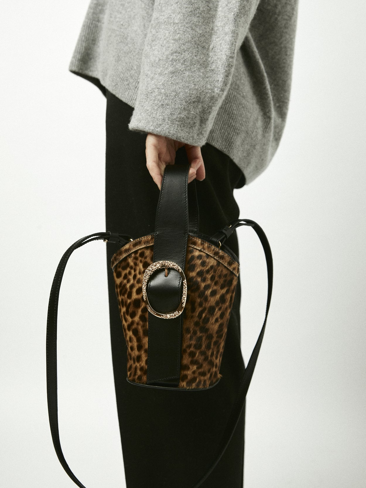 Ediciób Limitada. LE CUBITO es un bolso 3 en 1. Se puede llevar cruzado con bandolera, agarrado en la mano con su asa corta o pasado por la muñeca. Está realizado en piel vacuno de alta calidad con un animal print único en mezcla de piel. Cierre oculto de imán de máxima fuerza en vista interior. Forro interno en mezcla de algodón lino. Bolsillo interior de piel. Logo grabado con tinta blanca en la vista interior y exterior a fuego. Cantos tintados en negro con pincel a mano. Hebilla diseño exclusivo de JIMENAS en acabado oro tenue. La bandolera se puede quitar y poner mediante chupetes.
