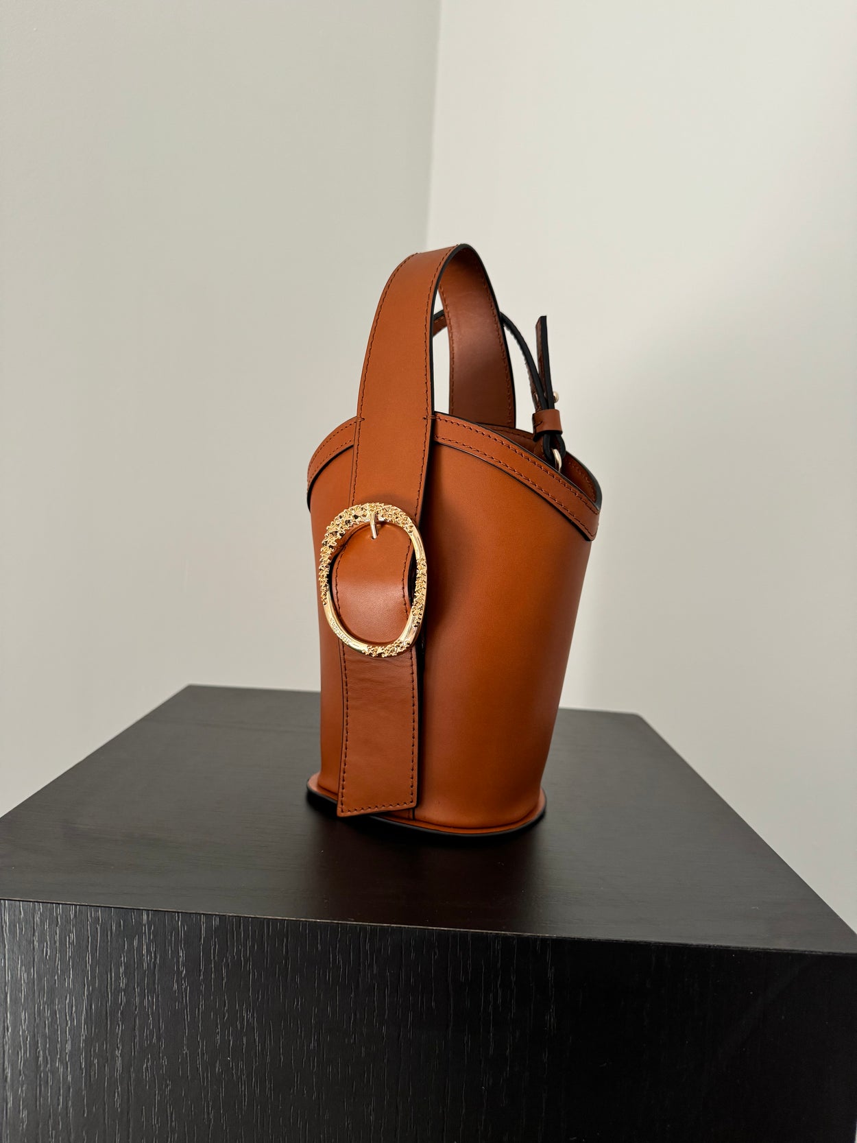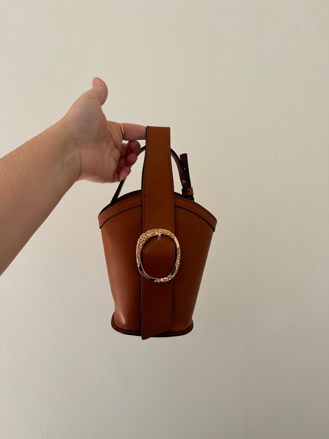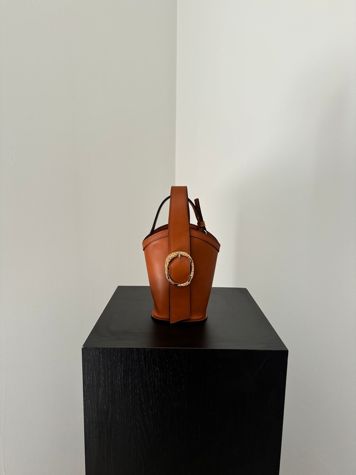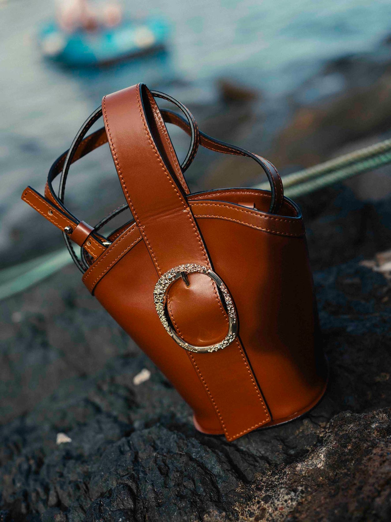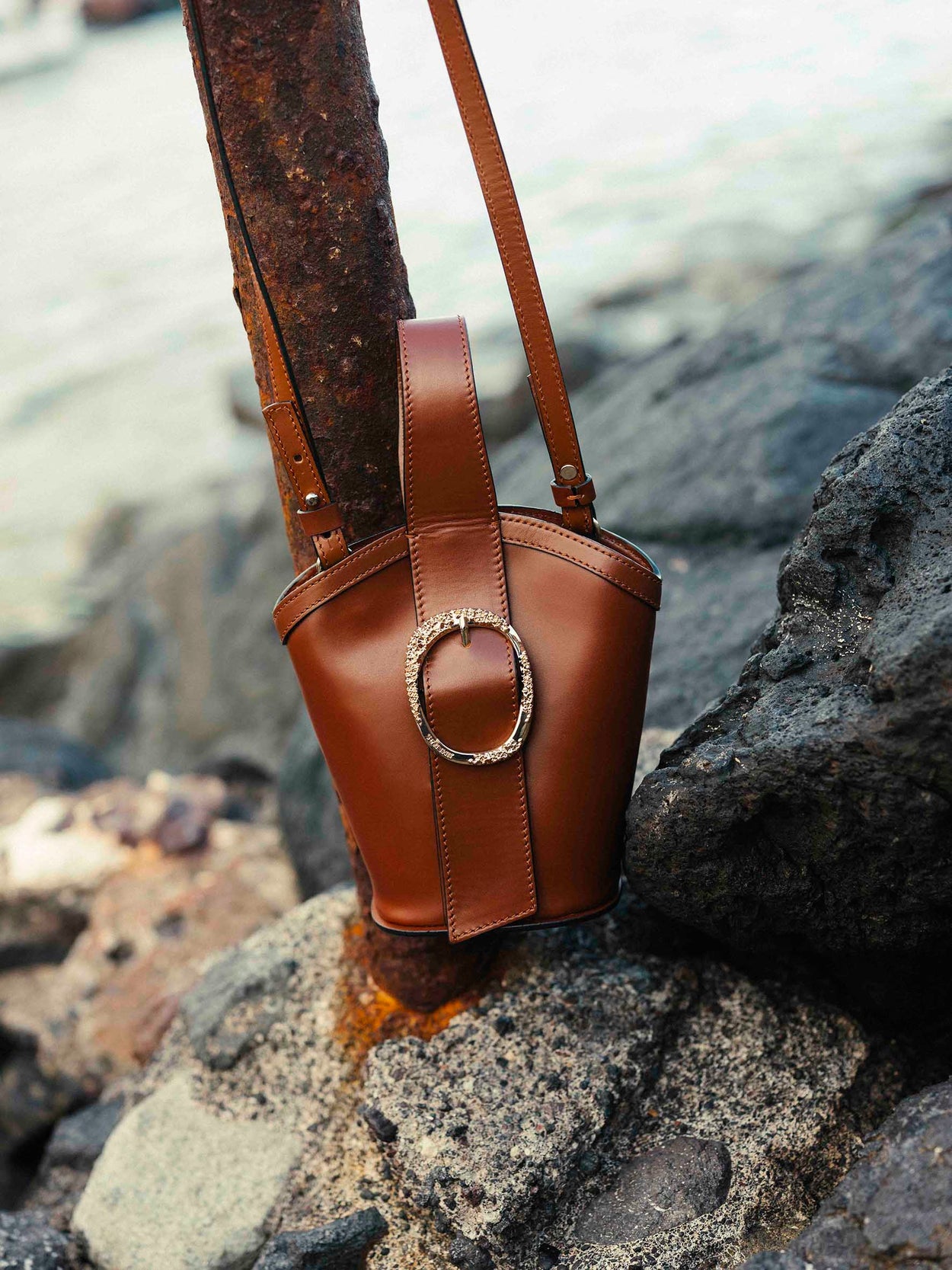 LE CUBITO es un bolso 3 en 1. Se puede llevar cruzado con bandolera, agarrado en la mano con su asa corta o pasado por la muñeca. Está realizado en piel vacuno de alta calidad en color cognac. Cierre oculto de imán de máxima fuerza en vista interior. Forro interno en mezcla de algodón lino. Bolsillo interior de piel. Logo grabado con tinta blanca en la vista interior y exterior a fuego. Cantos a contraste tintados en negro con pincel a mano. Hebilla diseño exclusivo de JIMENAS en acabado oro tenue. La bandolera se puede quitar y poner mediante chupetes.