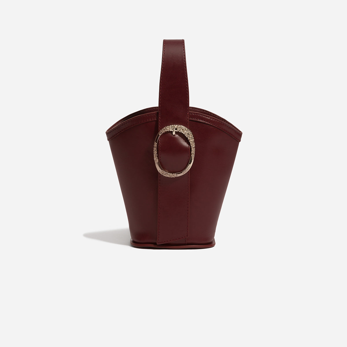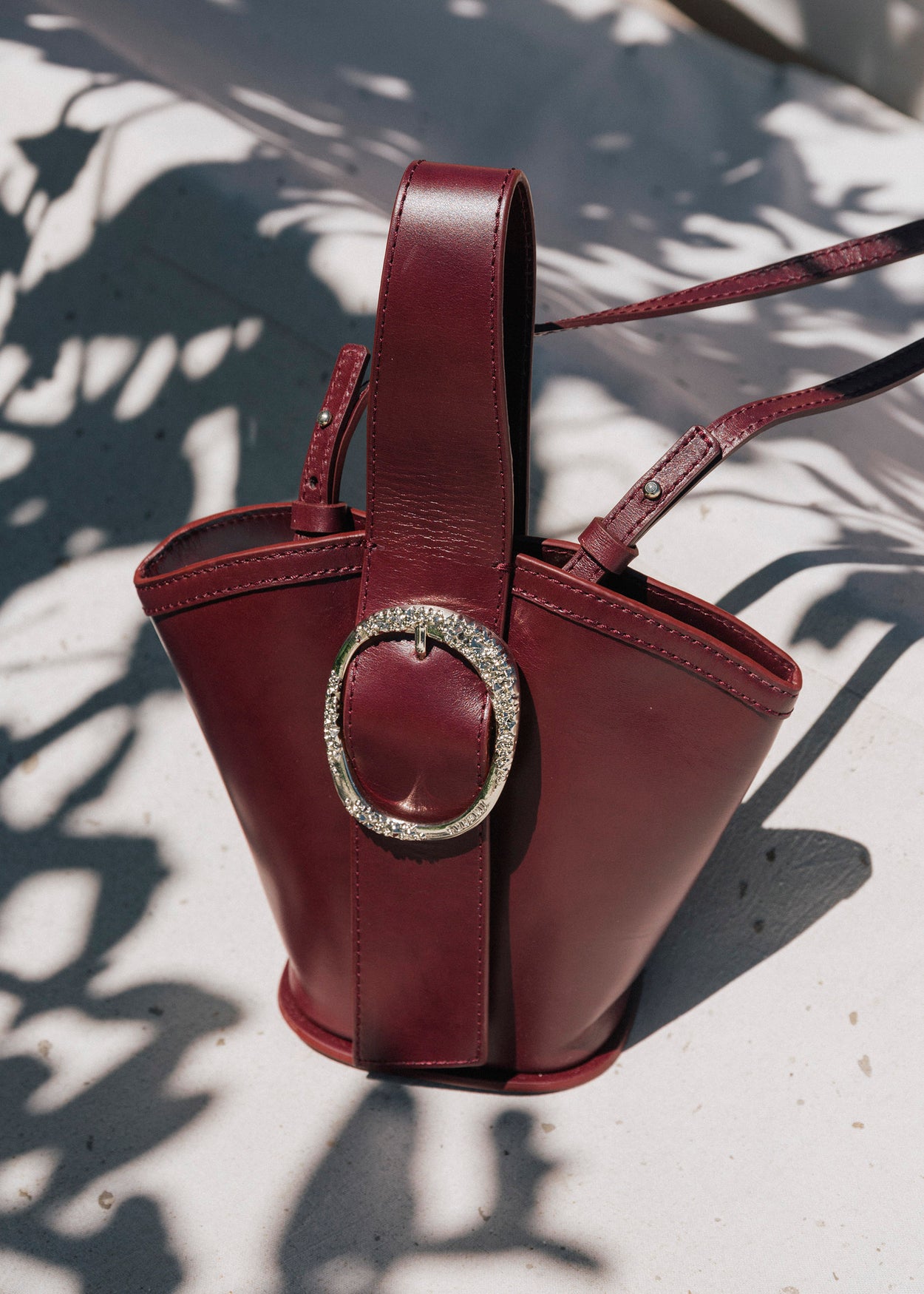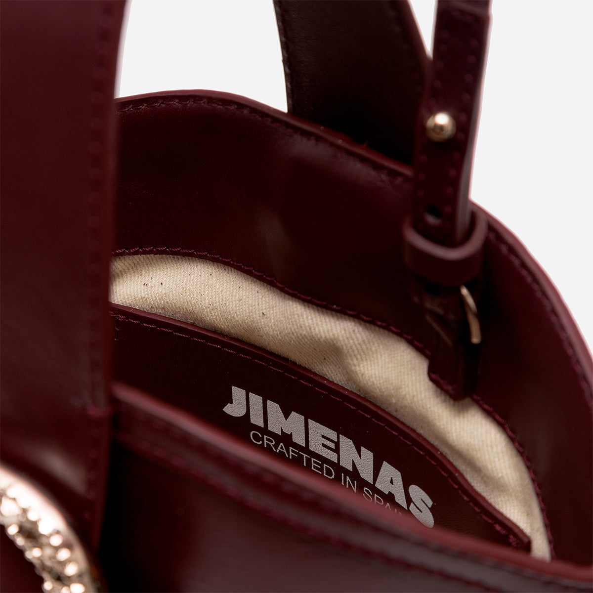 LE CUBITO es un bolso 3 en 1. Se puede llevar cruzado con bandolera, agarrado en la mano con su asa corta o pasado por la muñeca. Está realizado en piel vacuno de alta calidad en color vino. Cierre oculto de imán de máxima fuerza en vista interior. Forro interno en mezcla de algodón lino. Bolsillo interior de piel. Logo grabado con tinta blanca en la vista interior y exterior a fuego. Cantos a contraste tintados en negro con pincel a mano. Hebilla diseño exclusivo de JIMENAS en acabado oro tenue. La bandolera se puede quitar y poner mediante chupetes.