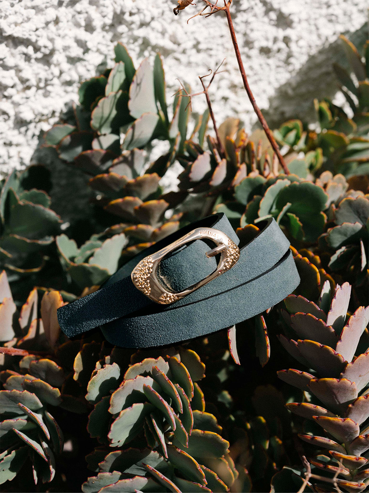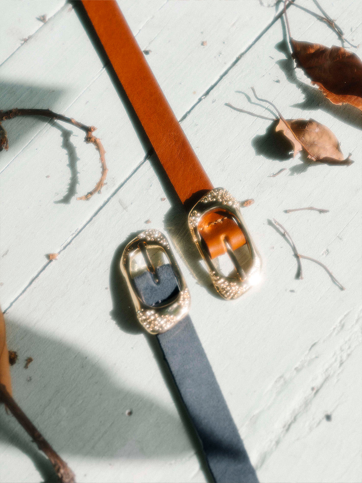 Nouvelle ceinture BIM BIM en croûte de cuir de vachette bleu de haute qualité . Fabriquée à la main à Valence par une famille de ceinturiers. Boucle dorée au design organique, exclusive à JIMENAS, fabriquée à Alicante.