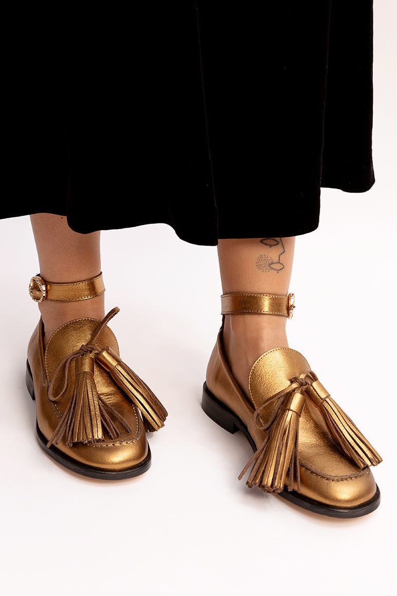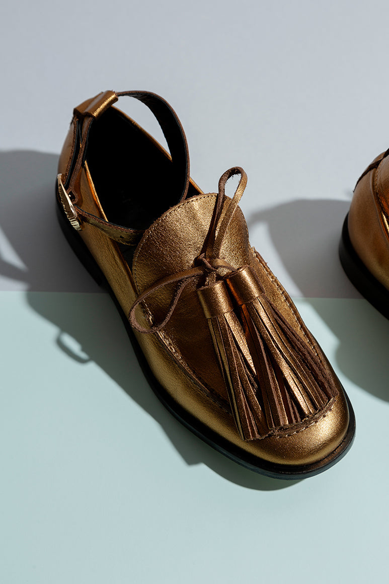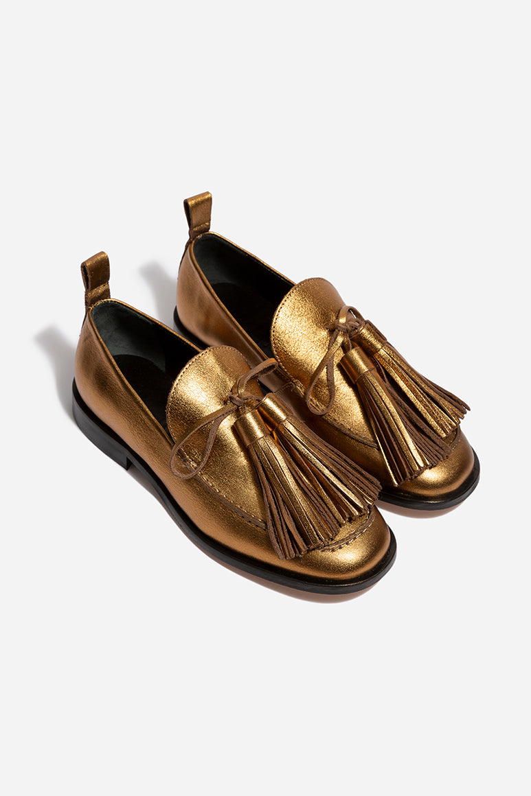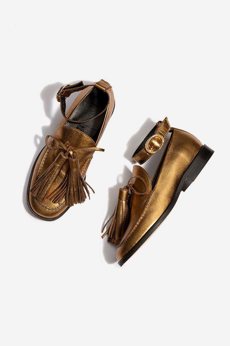 Le mocassin Diega est confectionné en cuir de vachette de première qualité avec une finition bronze métallisée. Il est doté de pompons surdimensionnés noués par un nœud et entièrement doublé de cuir, avec un logo embossé sur la semelle intérieure. La semelle est en cuir naturel de haute qualité. La bride cheville est amovible ou amovible. Les boucles sont une création exclusive JIMENAS, développée à Petrer, Alicante.