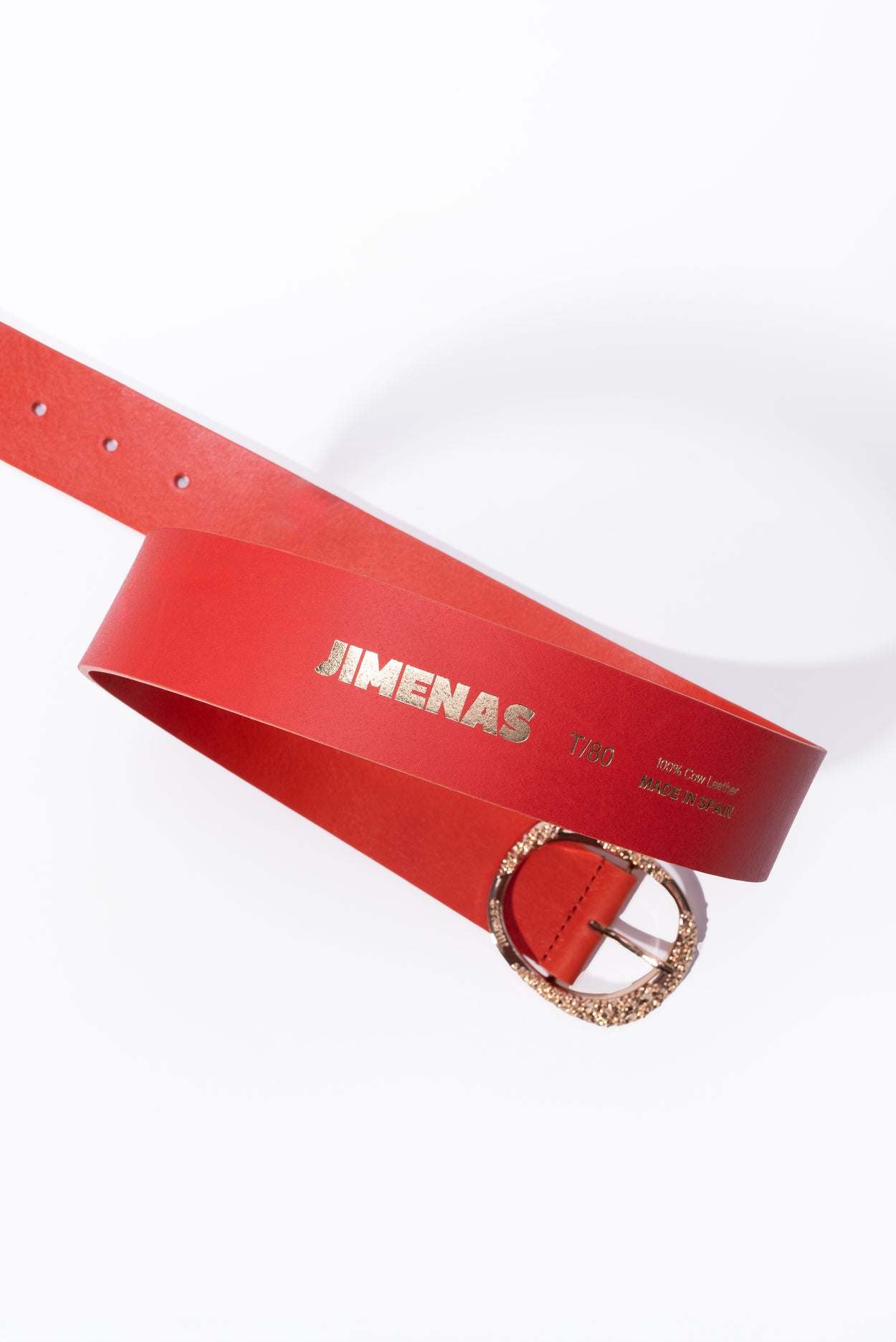 Ceinture MATILDE en cuir de vachette orange de haute qualité, fabriquée artisanalement à Valence par une famille de ceinturiers. Bords brossés à la main. Boucle dorée exclusive JIMENAS, fabriquée à Alicante.