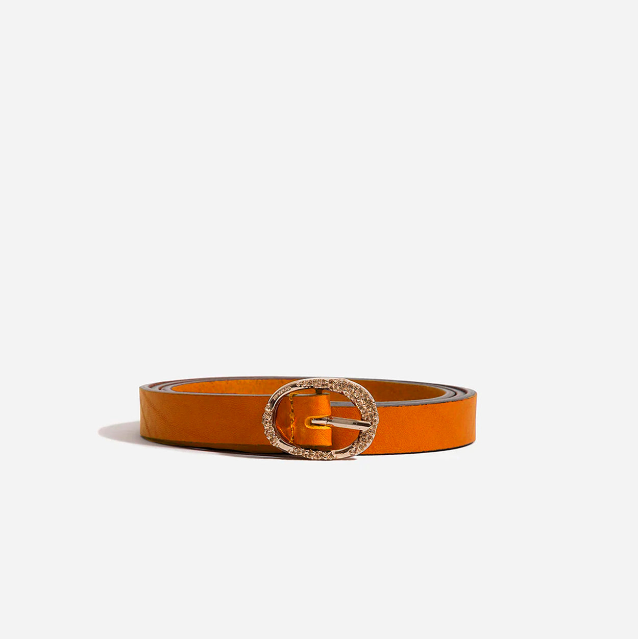 Ceinture MATILDITO en cuir de vachette couleur mandarine de haute qualité, fabriquée à la main à Valence. Par une famille de fabricants de ceintures. Boucle en or exclusive JIMENAS, fabriquée à Alicante.
