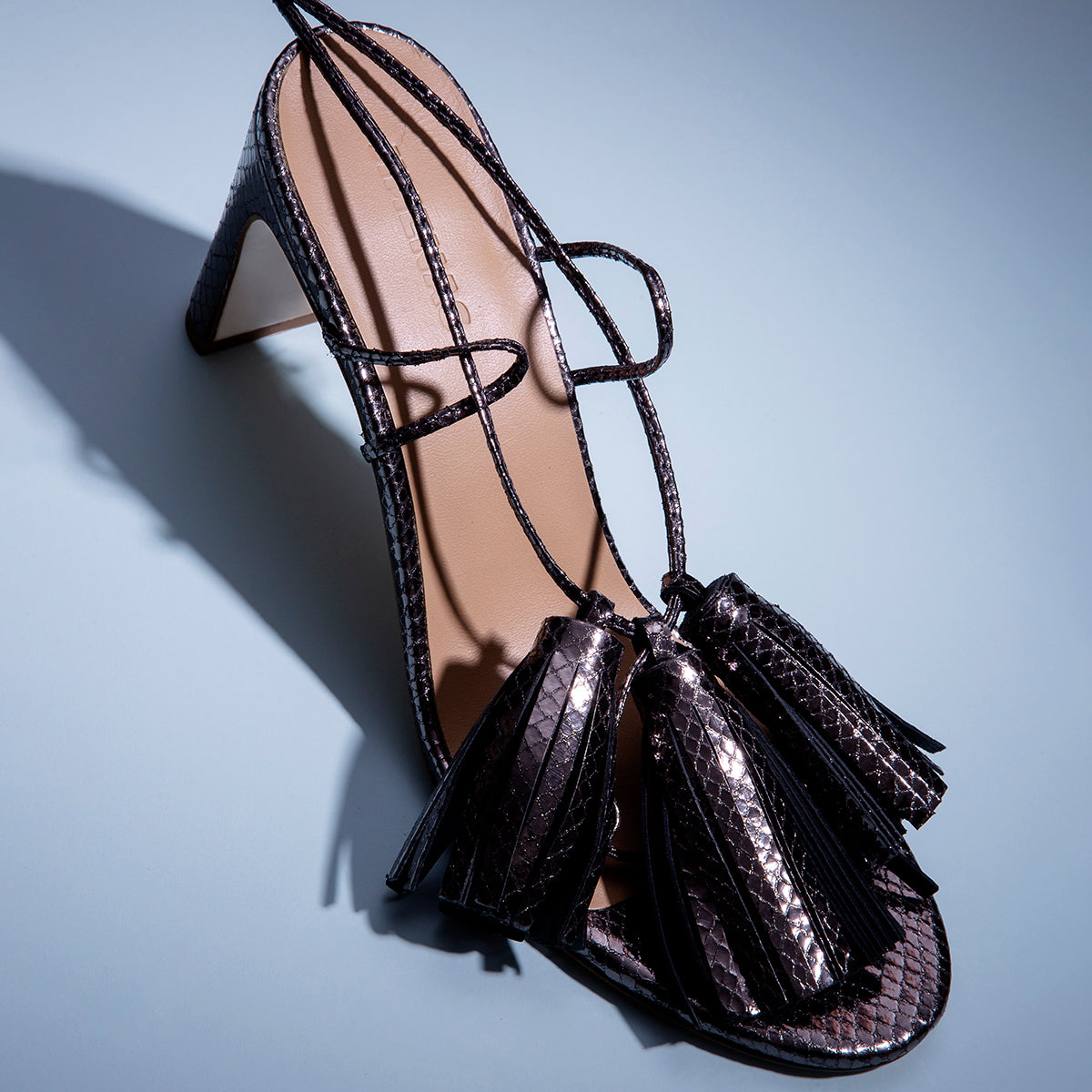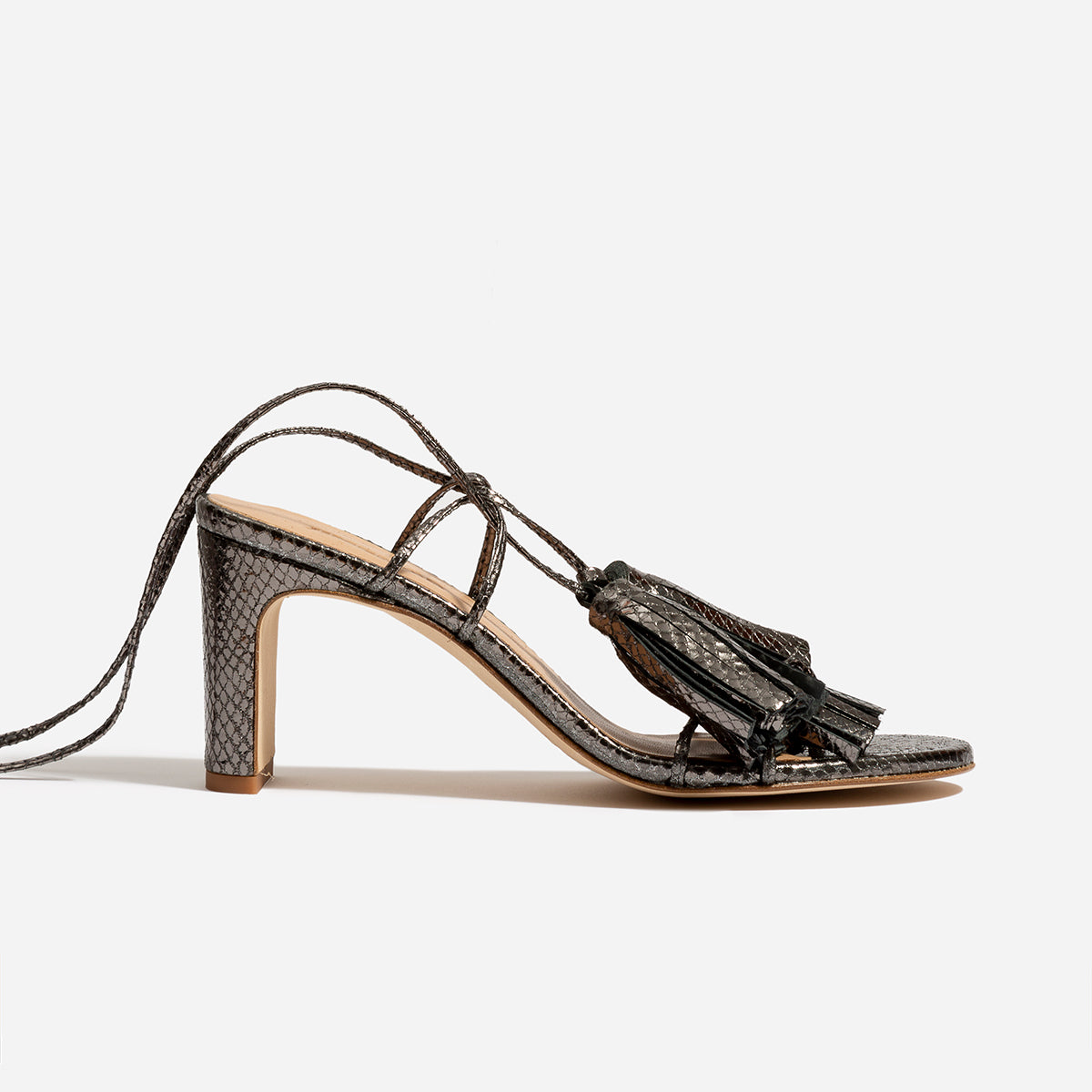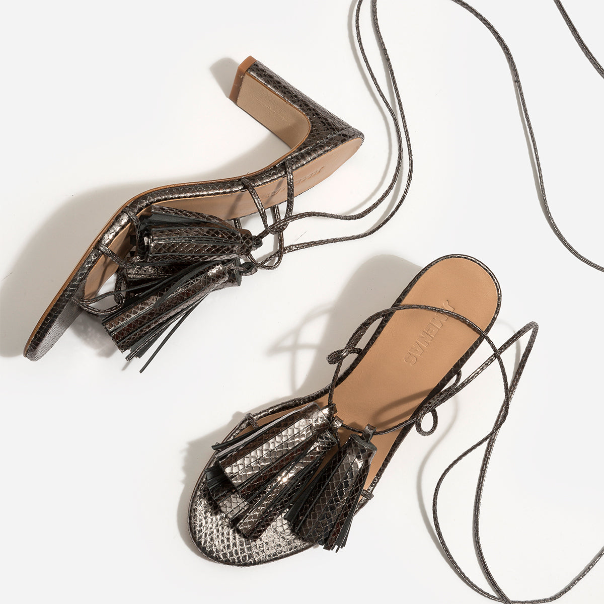 NOUVELLE SARETA, une version revisitée avec un talon de 7 cm et un bout rond, pour un confort optimal. Pour celles qui n'optent pas pour le doré lors de leurs événements, ou pour les mariées/invitées qui préfèrent les tons argentés, nous avons développé une nouvelle couleur baptisée FUMÉ.